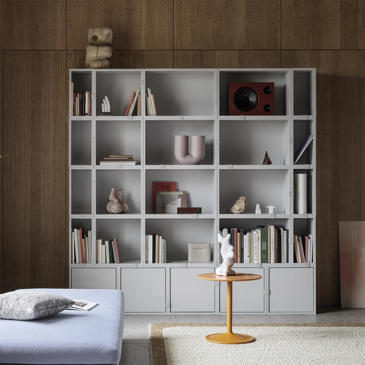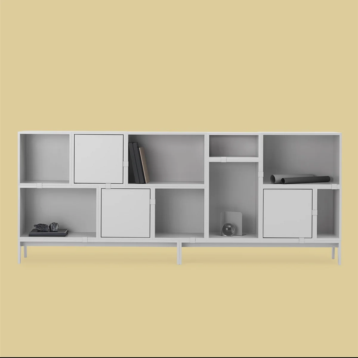 Die Module des Stacked Regalsystems in der Variante hellgrau von Muuto sind mit oder ohne Rückwände erhältlich. Zudem gibt es zur Stacked-Serie ein Podium, mit dem die einzelnen Stacked-Komponenten erhöht aufgestellt werden können, etwa um ein Sideboard zu errichten.