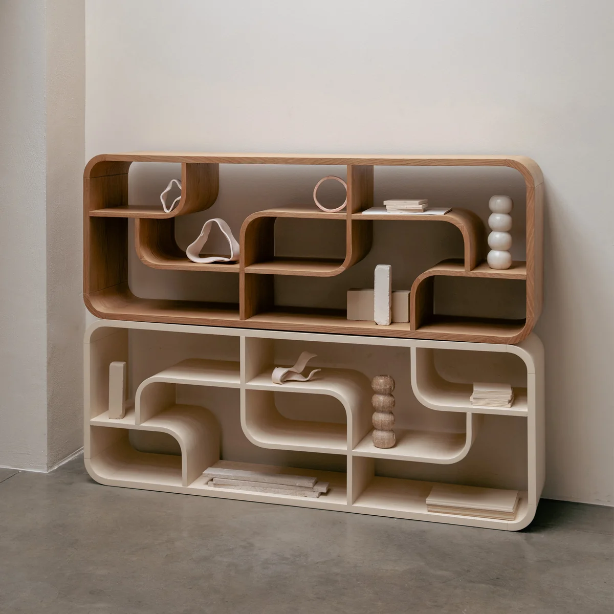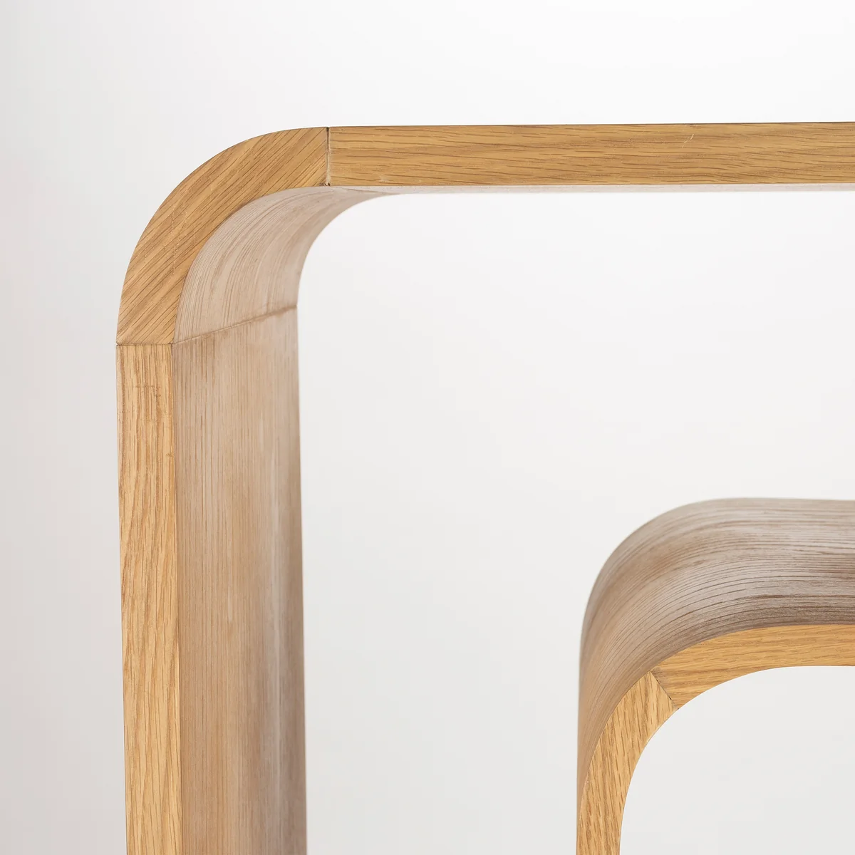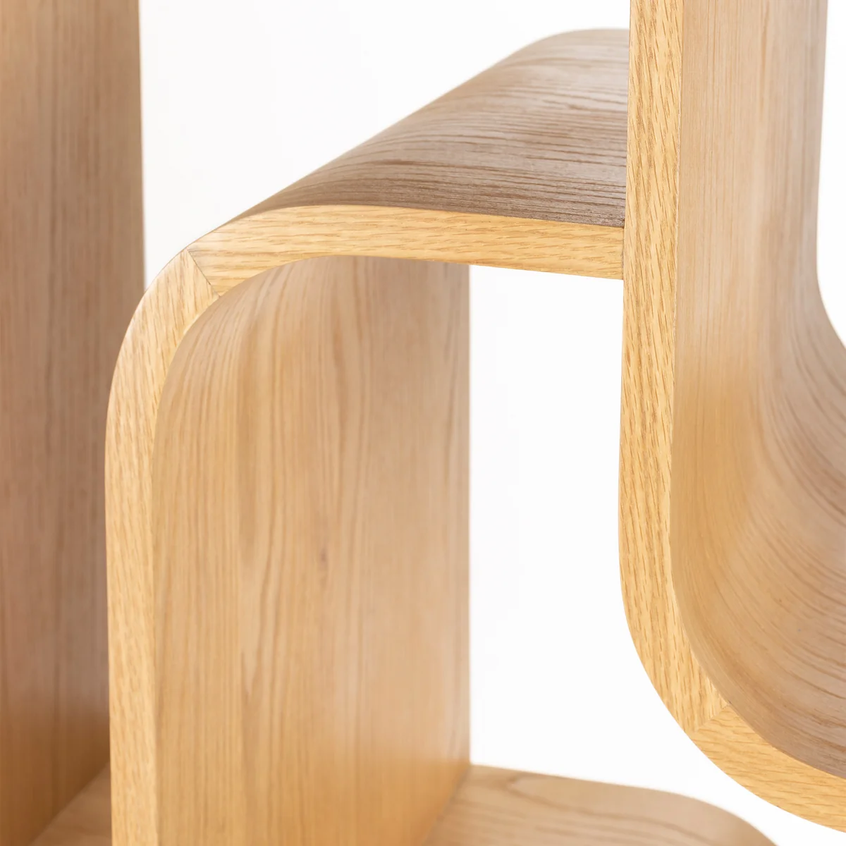 Das Seven Standregal von Zuiver überzeugt durch eine ausdrucksstarke Formsprache: Sieben rund geschwungene Fächer bilden die charakteristische Bogenstruktur, die dem Regal seinen Namen verleiht. Mit natürlichem Eichenfurnier veredelt, bringt es warme Wohnlichkeit und klare Form in Einklang – ein Möbelstück, das sowohl als Stauraum als auch als Designobjekt überzeugt.