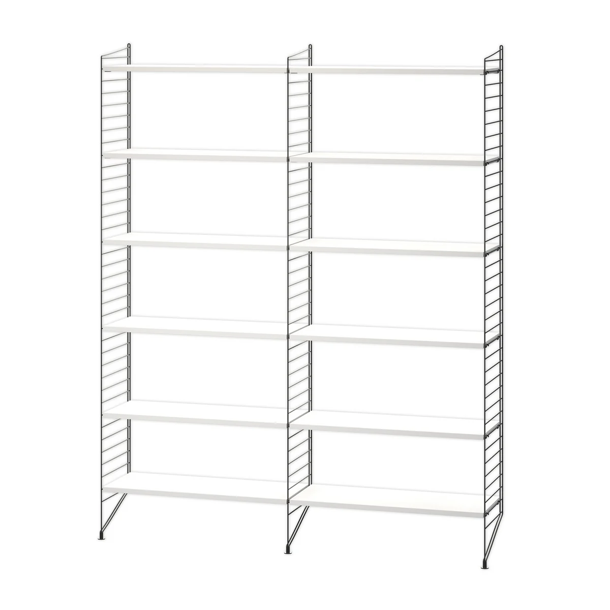 Die Regalkombination von String bietet ein flexibles und modernes Aufbewahrungssystem, das sich ideal für Wohn- und Arbeitsräume eignet. Vorkonfiguriert aus drei stabilen Bodenleitern und 12 robusten Regalböden sorgt sie für viel Stauraum und optimale Ordnung. Das klare, zeitgemässe Design und die hochwertige Verarbeitung garantieren Langlebigkeit und eine vielseitige Anpassungsmöglichkeit an individuelle Raumkonzepte. Die modulare Bauweise ermöglicht es, das Regalsystem flexibel zu erweitern und perfekt in unterschiedliche Umgebungen zu integrieren, wodurch es sowohl als stilvolles Einrichtungselement als auch als funktionale Aufbewahrungslösung überzeugt.
