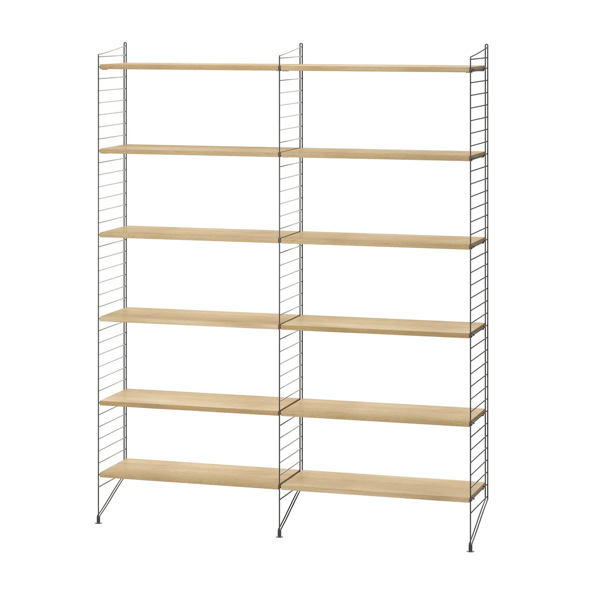 Die Regalkombination von String bietet ein flexibles und modernes Aufbewahrungssystem, das sich ideal für Wohn- und Arbeitsräume eignet. Vorkonfiguriert aus drei stabilen Bodenleitern und 12 robusten Regalböden sorgt sie für viel Stauraum und optimale Ordnung. Das klare, zeitgemässe Design und die hochwertige Verarbeitung garantieren Langlebigkeit und eine vielseitige Anpassungsmöglichkeit an individuelle Raumkonzepte. Die modulare Bauweise ermöglicht es, das Regalsystem flexibel zu erweitern und perfekt in unterschiedliche Umgebungen zu integrieren, wodurch es sowohl als stilvolles Einrichtungselement als auch als funktionale Aufbewahrungslösung überzeugt.