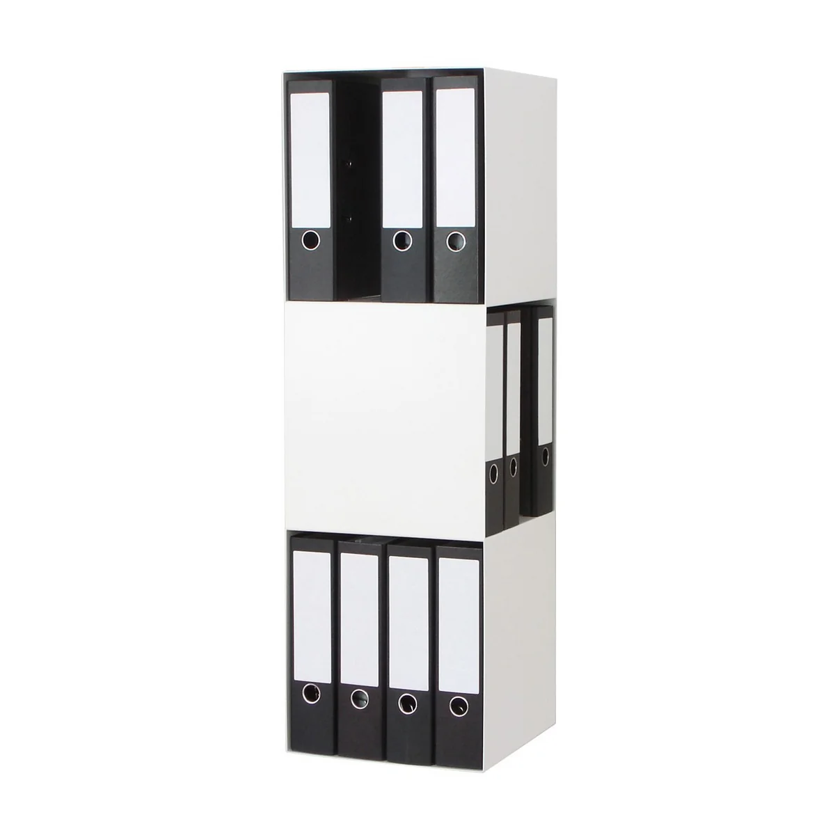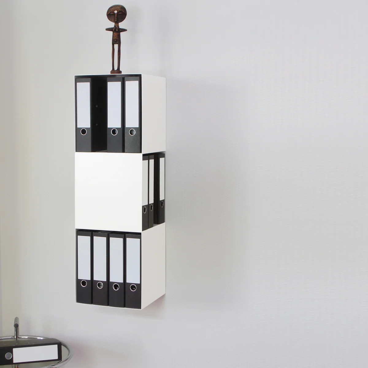 Die Besonderheit der Office Box ist der Mittelteil: Wie auch die anderen Elemente der 2side-Serie von vonbox lässt sich die Office Box von zwei Seiten - frontal und seitlich - befüllen, wobei der Mittelteil seitlich mit Ordnern ausgestattet wird. Durch diesen um 90 Grad gedrehten Mittelteil wirkt das Regal aussergewöhnlich und strahlt gleichzeitig eine besondere Ruhe aus, da die schlichte weisse Fläche die Ordnerreihen unterbricht.