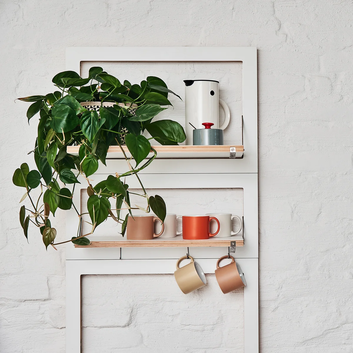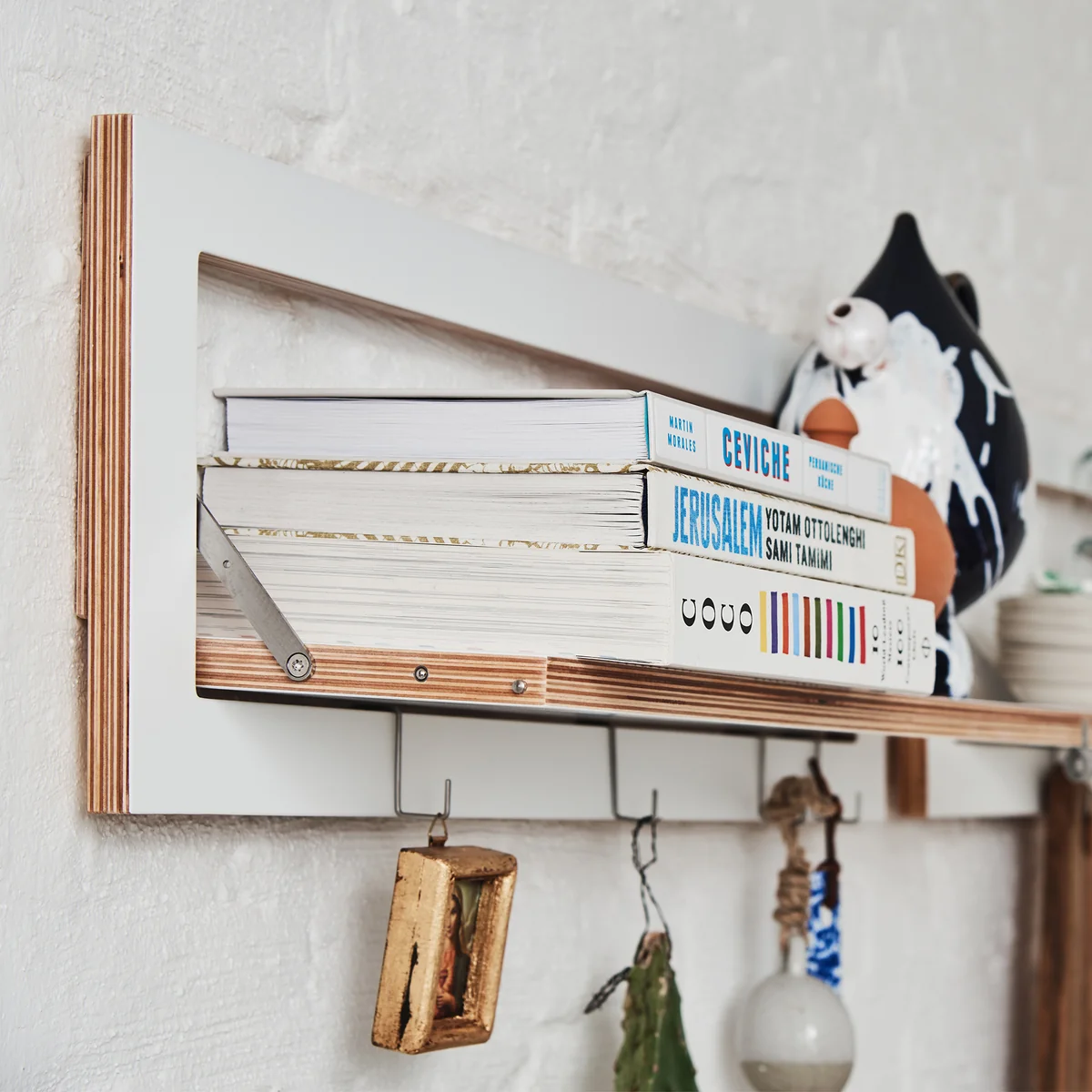 Die Regale werden aus Multiplex Birke mit Edelstahlscharnieren hergestellt. Sie werden in Handarbeit lackiert und sind in verschiedenen Farben erhältlich. Eine kleine Schlaufe aus Filz erleichtert das Herunterklappen des Regalbodens.