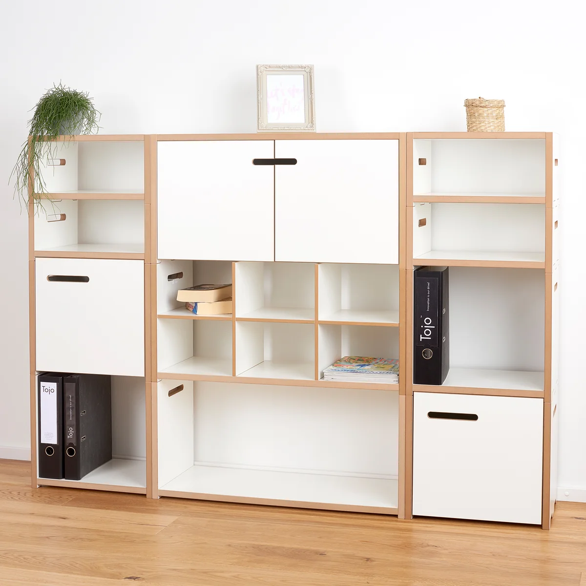 Das halbstark Regalsystem besteht aus Grund- und Anbaumodulen. Die Grundmodule bilden immer den oberen Abschluss eines Regales, können aber auch gut alleine stehen. Die Anbaumodule wurden für den unteren Teil des Regals konzipiert. Für noch mehr Individualität, sind die Module auch in einer niedrigen Variante erhältlich, die nur halb so hoch sind wie die gängigen Module. Praktisch sind auch die Module mit Türen, hinter denen sich allerlei Kleinigkeiten verstauen lassen.