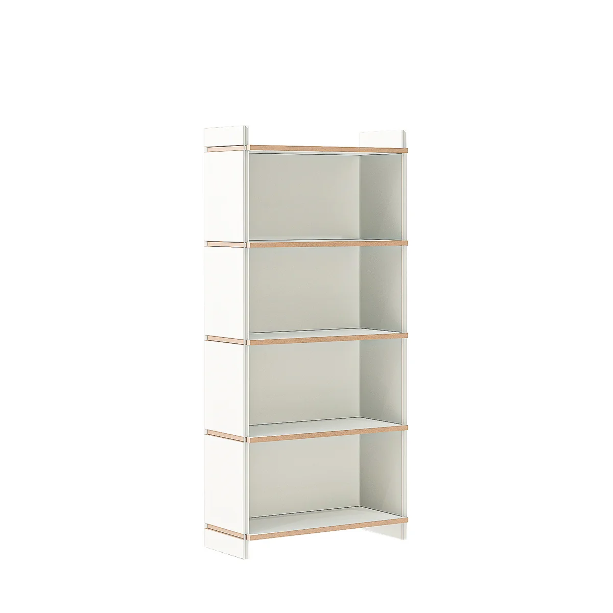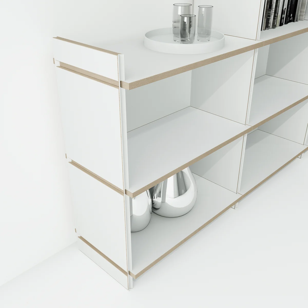 Die Module des mehrfach Regalsystems werden aus mit Melaminharz beschichtetem MDF in Weiss hergestellt.