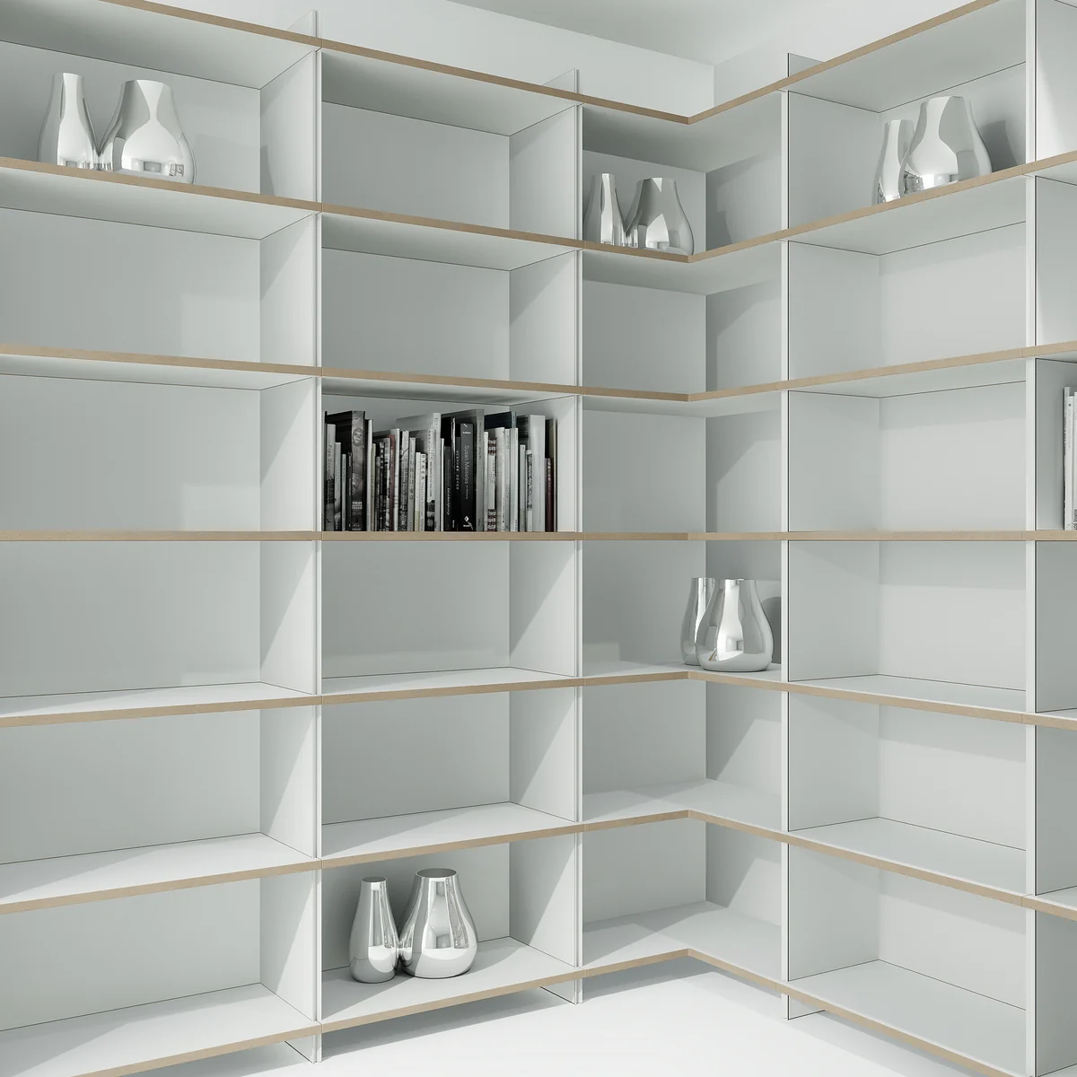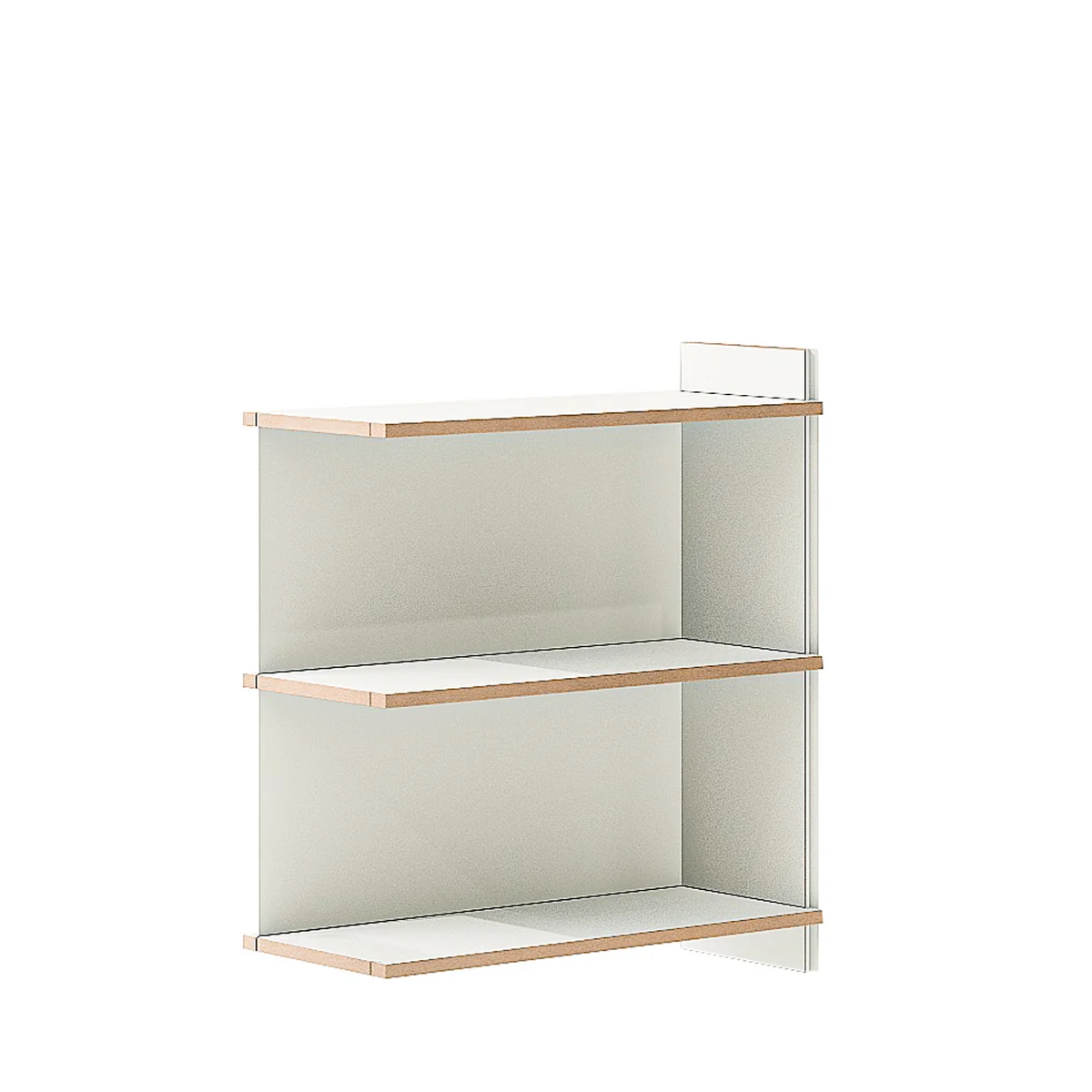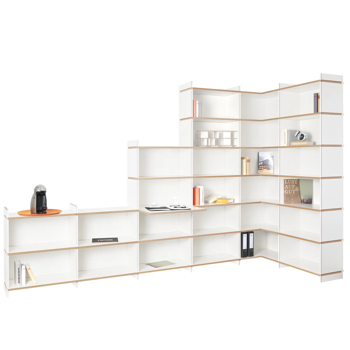 Eckmodule ermöglichen auch Konstruktionen, die sich optimal in Raumecken einfügen. Die Regalerweiterung „schreibboden“ fügt in das Regalsystem einen nützlichen Sekretär mit praktischem Kabeldurchgang ein.