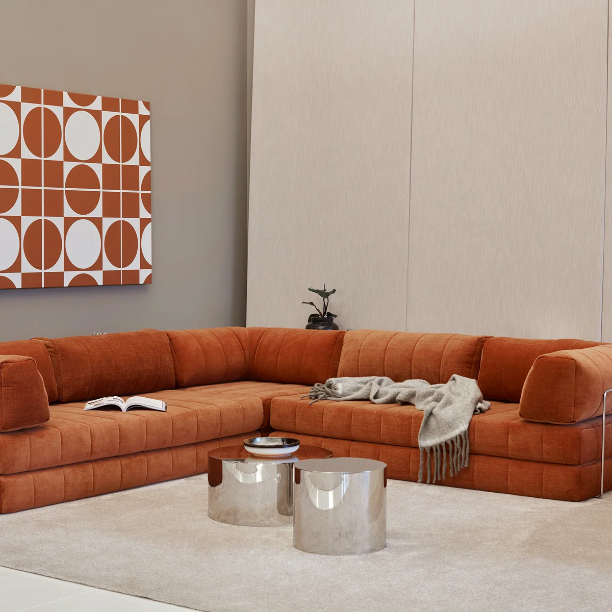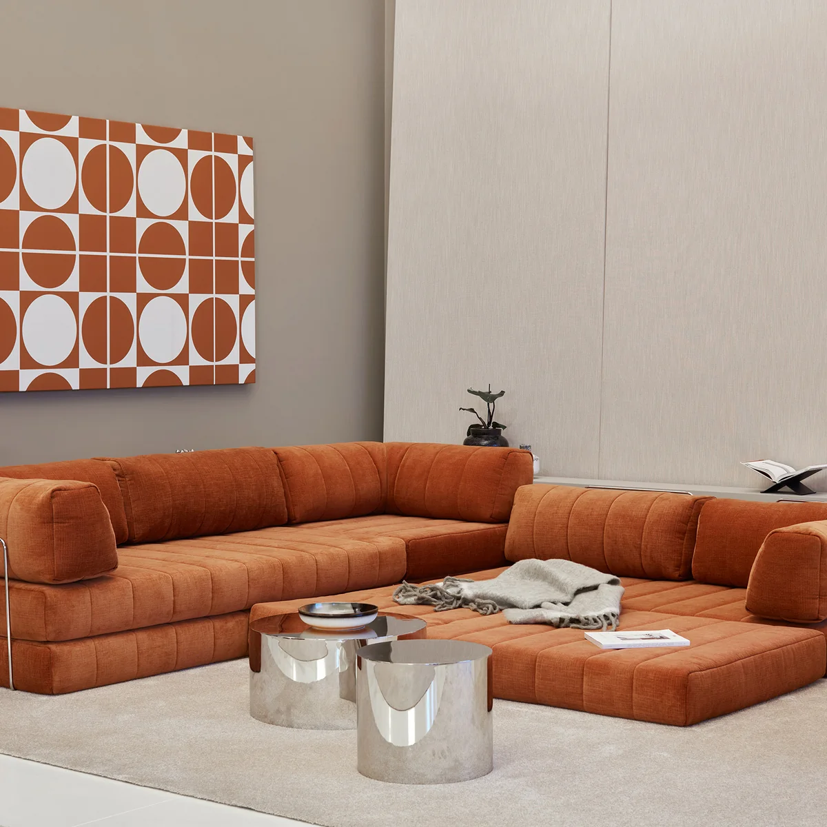 Charakteristisch sind die L-förmigen Rückenpolster, die eine besonders entspannte Sitz- und Liegeposition ermöglichen. Sie schaffen eine gemütliche, umschliessende Wirkung und unterstreichen den loungeartigen Charakter des Sofas. Gleichzeitig lassen sich die losen Kissen flexibel anordnen und je nach Bedarf neu positionieren.