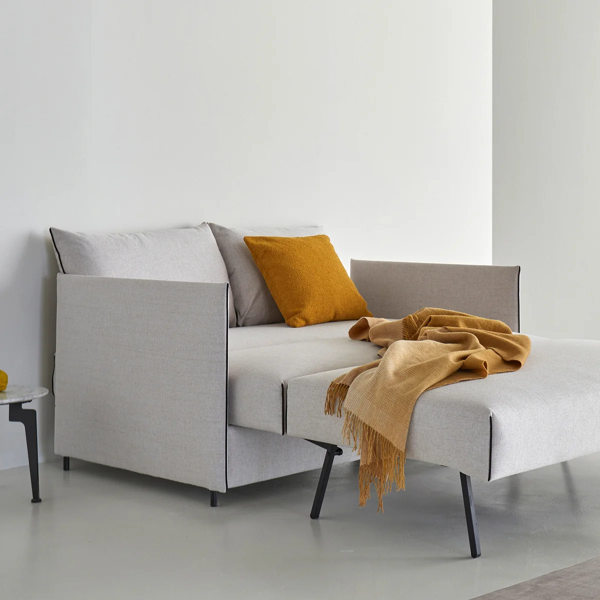 Das Luoma Schlafsofa wurde von Per Weiss für Innovation Living entworfen und überzeugt durch seine klare, moderne Gestaltung. Es benötigt im Alltag nur wenig Platz und verwandelt sich im ausgeklappten Zustand in eine komfortable Schlafgelegenheit – ideal für flexible Wohnsituationen.