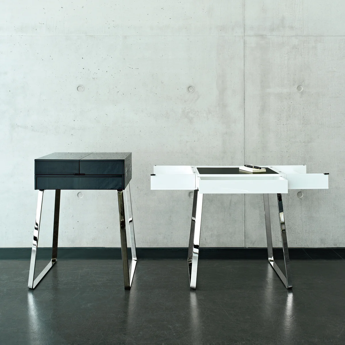 Zelos glänzt mit einem elegantem Design aus hochglanzlackiertem Echtholz und einem Gestell aus verchromten Flachstahl.