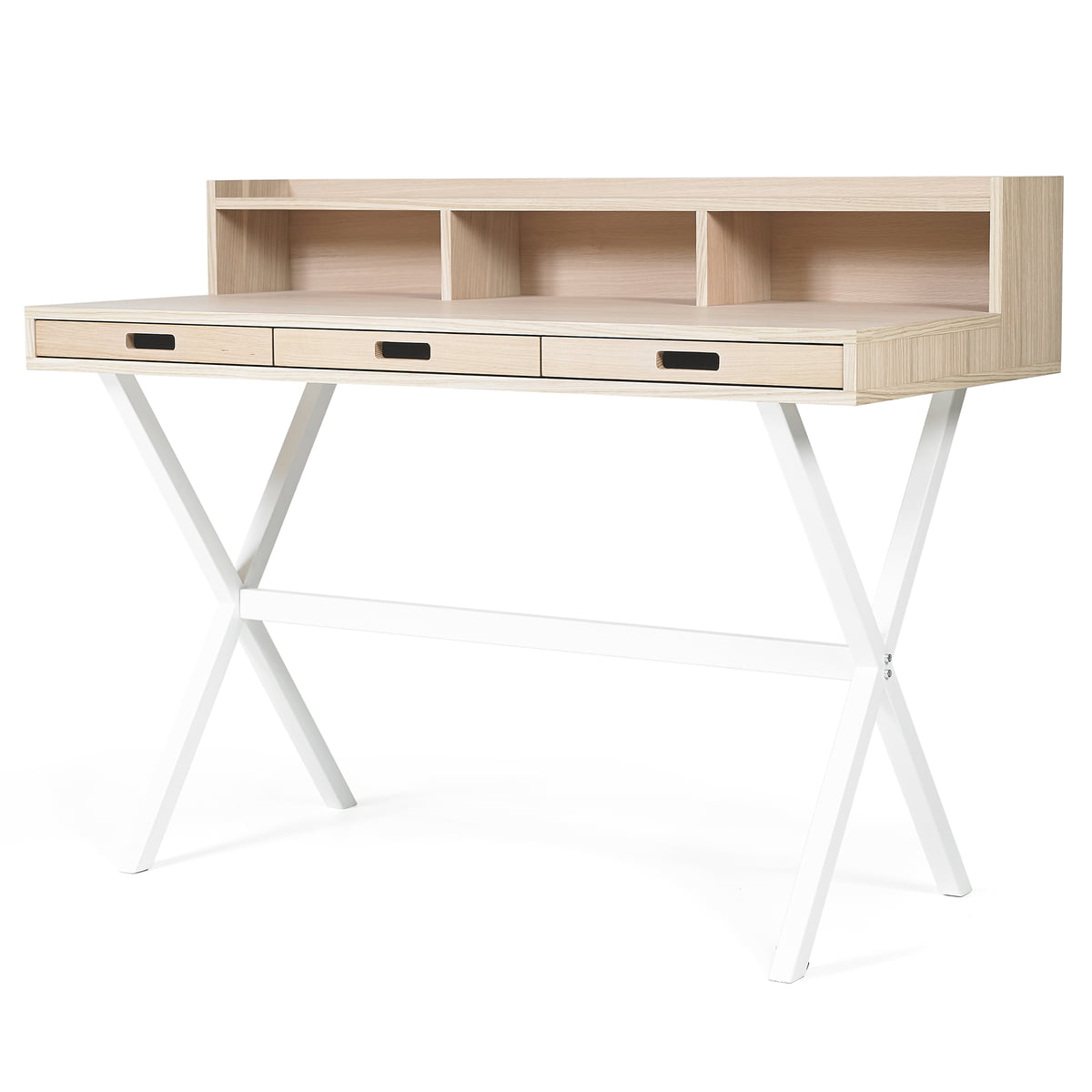 Der Sekretär mit drei Schubladen wird aus MDF hergestellt und mit hochwertigem Holzfurnier verkleidet. Der Korpus ruht dabei auf einem Vierbein-Bockgestell aus matt lackiertem Metall in verschiedenen Farben. Das Untergestell in Schwarz und Weiß fügt sich hervorragend in schlichte Einrichtungen ein und die knalligen Farben wie Gelb, Rot oder Weißgrün sind ein echter Hingucker im Arbeitszimmer.