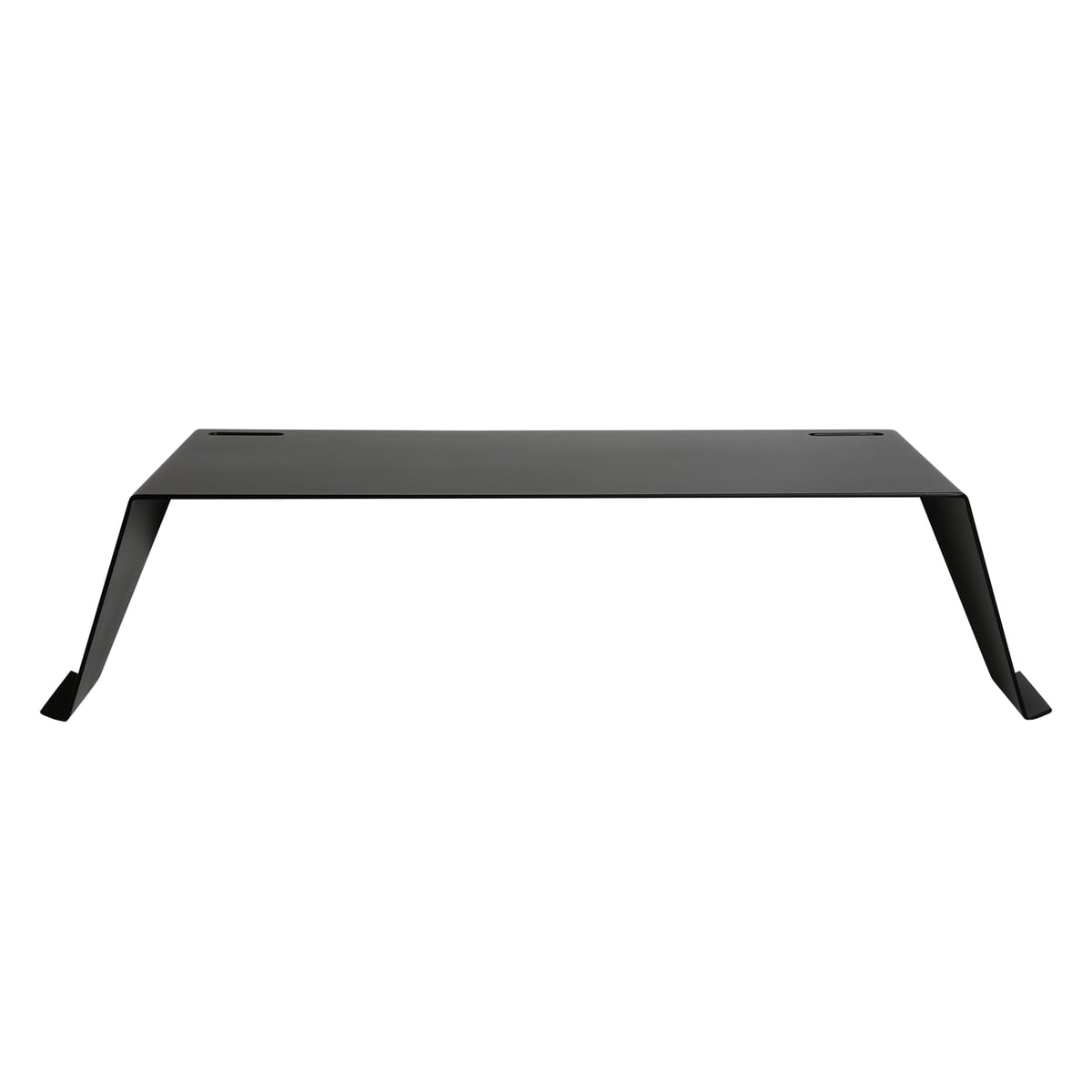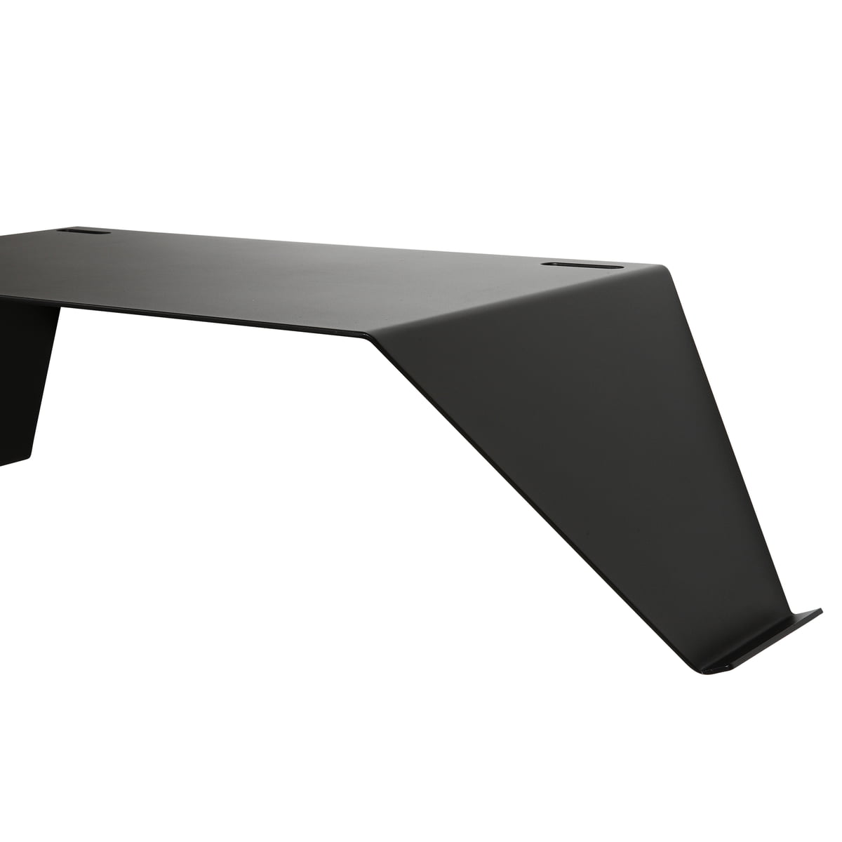 Der schwebende Schreibtisch wird aus pulverbeschichtetem Stahl hergestellt. An den Seiten können Zeitungen, Bücher und Magazine in einem Halter abgelegt werden und Kabel gehen durch spezielle Öffnungen dezent an der hinteren Seite des Tisches nach unten.