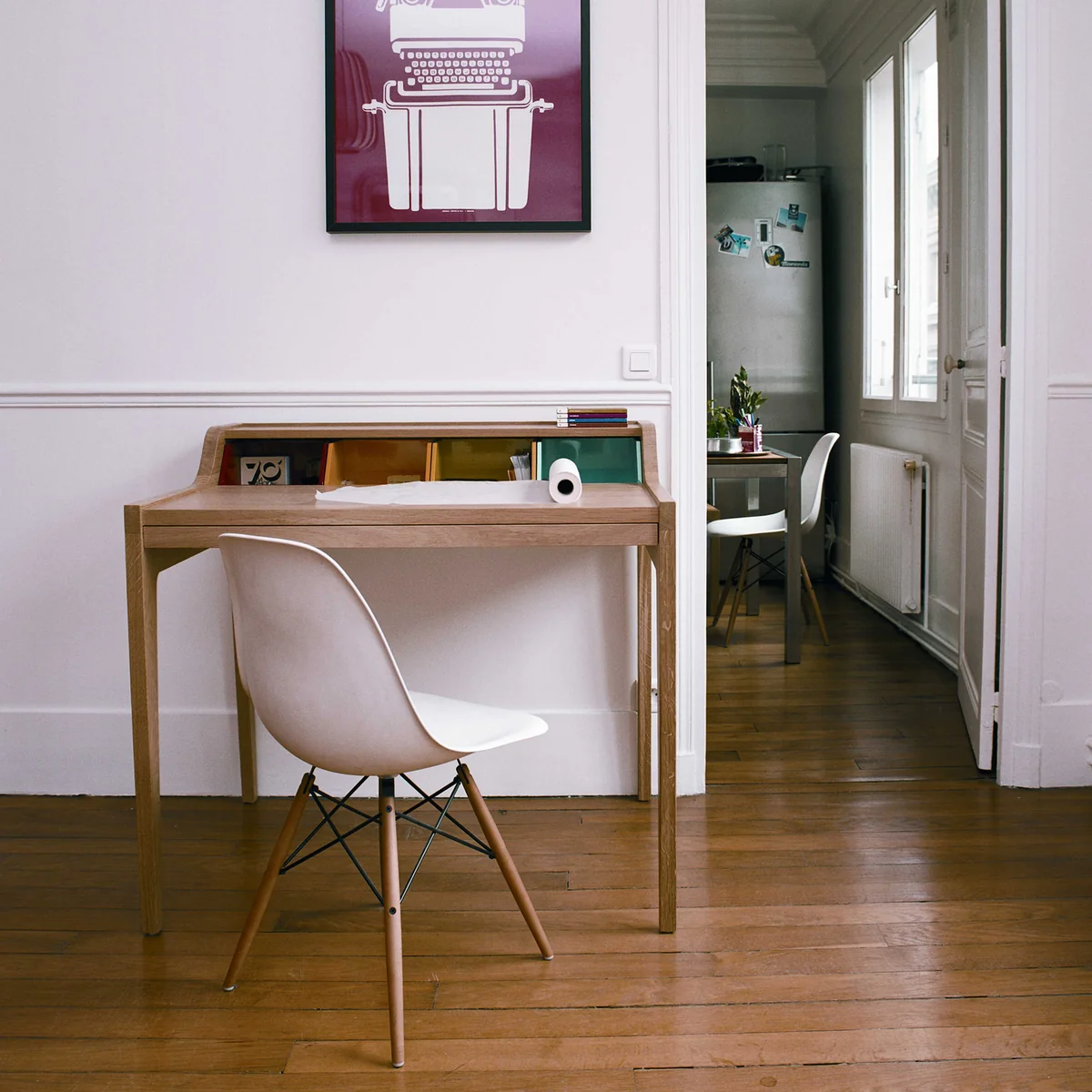 Das Design des Schreibtischs stammt von Gesa Hansen. Er passt ebenso in moderne Wohnzimmer wie klassische Arbeitszimmer. Der Tisch bietet Stauraum und reichlich Platz zum Arbeiten. Die Tischplatte kann nach vorne ausgezogen werden und über den vier farbenfrohen Ablagefächern befindet sich zusätzliche Stellfläche. Die Fächer können bei Bedarf problemlos entnommen werden.