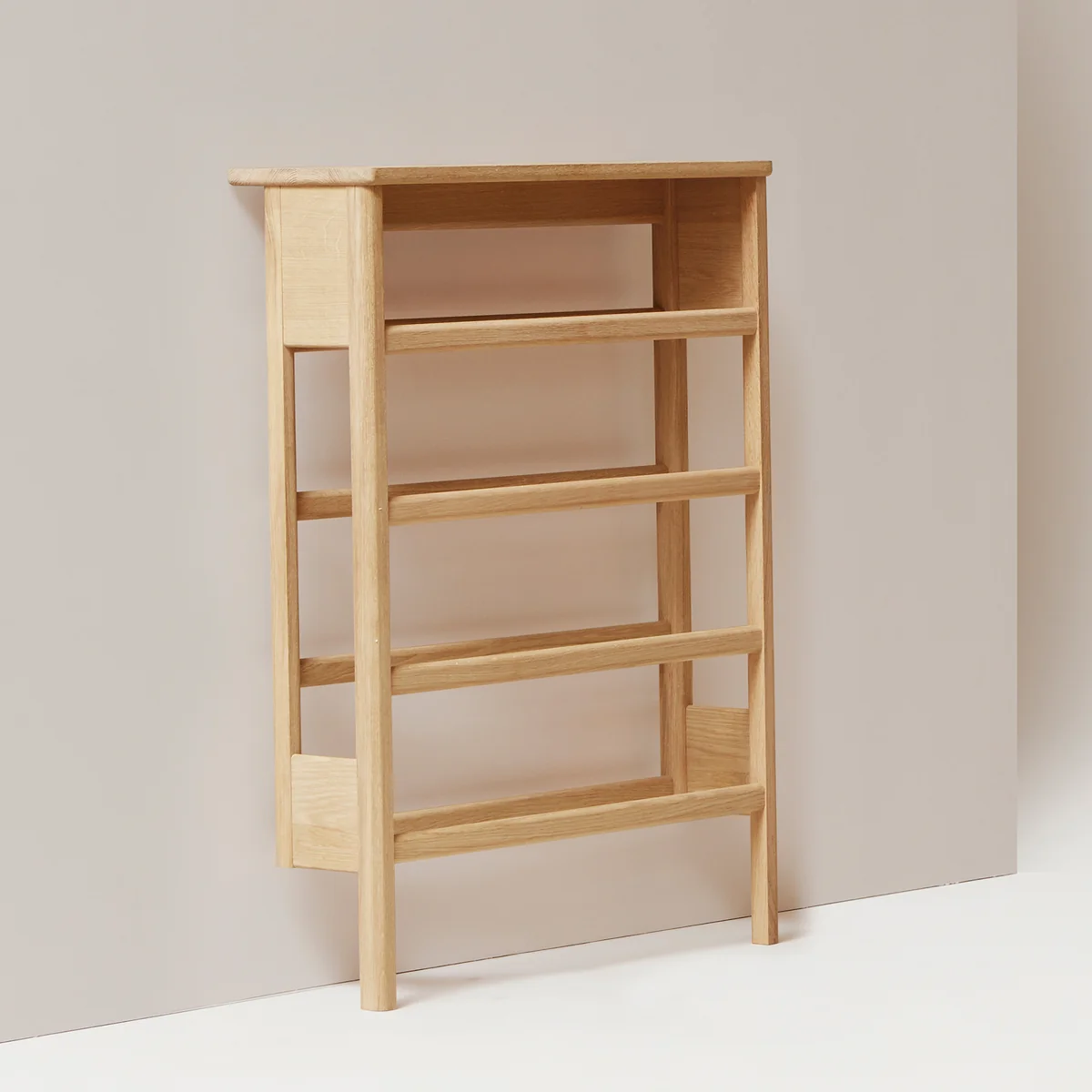 Das A Line Schuhregal von Form & Refine vereint ein praktisches Schuhregal mit den Vorzügen einer Ablage. Ob im Flur, dem Eingangsbereich, dem Ankleidezimmer oder dem Haushaltsraum: Bis zu 12 Paar Schuhe lassen sich in die Regale einsortieren, die oberste Strebe dient als Ablage für die kleinen Gegenstände des Alltags. Dank des ausgeklügelten Designs lässt sich das regal komfortable an die Wand lehnen, bei Bedarf auch befestigen.