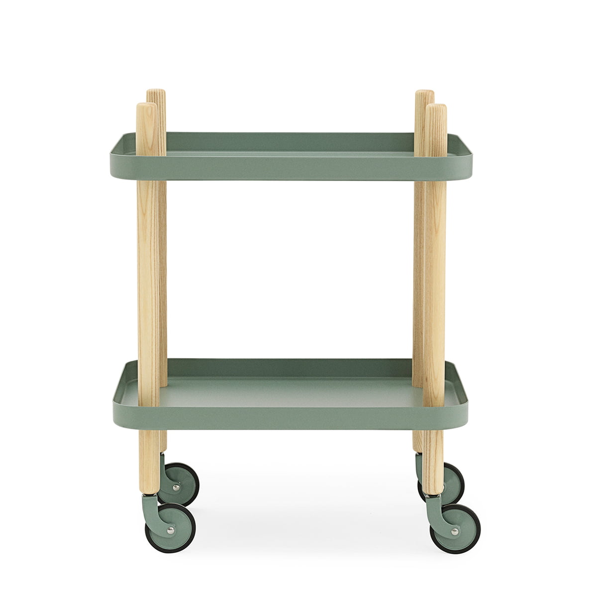 Der Block Beistellwagen von Normann Copenhagen kommt mit vier Rädern, mit denen sich der Wagen bei Bedarf verschieben lässt. Da die Räder jedoch nicht drehbar sind, ist der Block-Wagen nur bedingt zum regelmässigen Servieren und Hin- und Herfahren geeignet, sondern viel eher für den flexiblen Einsatz im Wohn- und Schlafzimmer, wo der Wagen als Beistelltisch, Couch- oder Nachttisch eingesetzt werden kann.