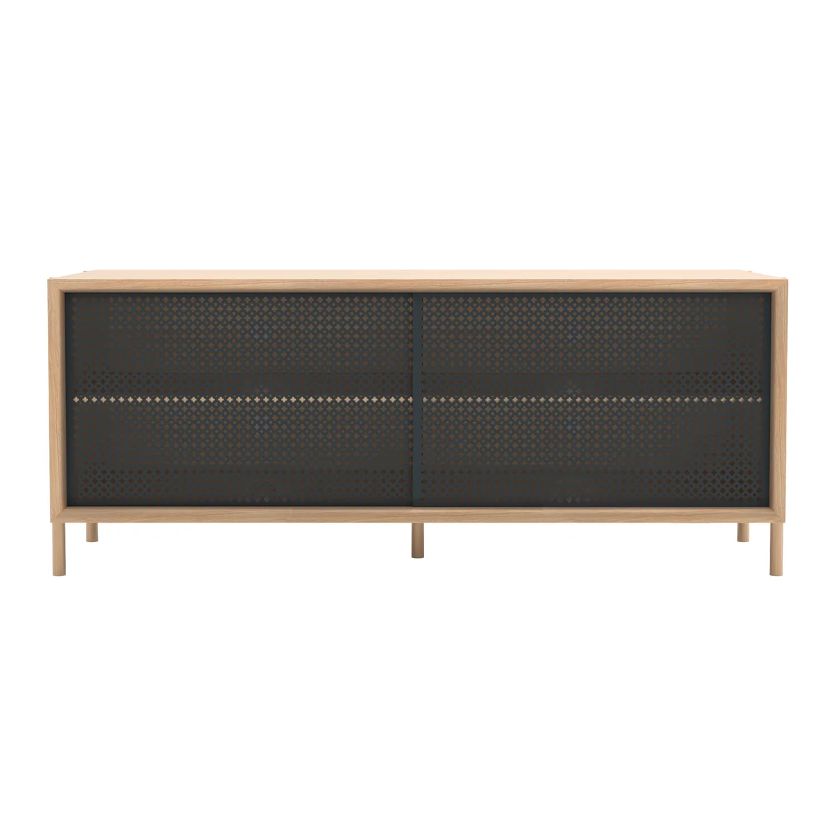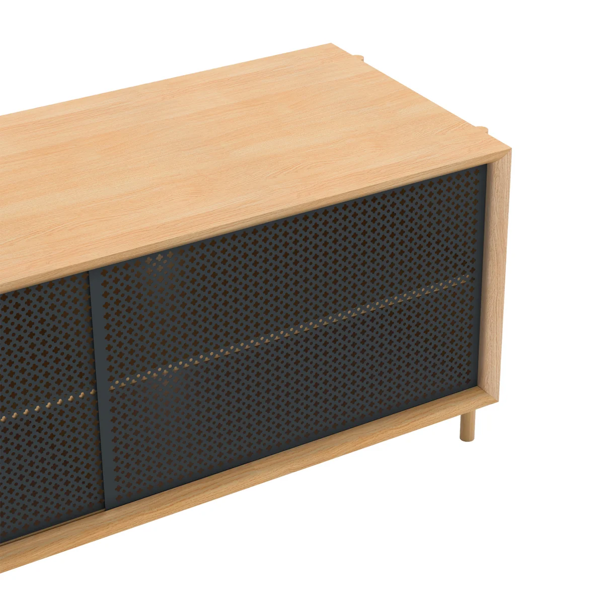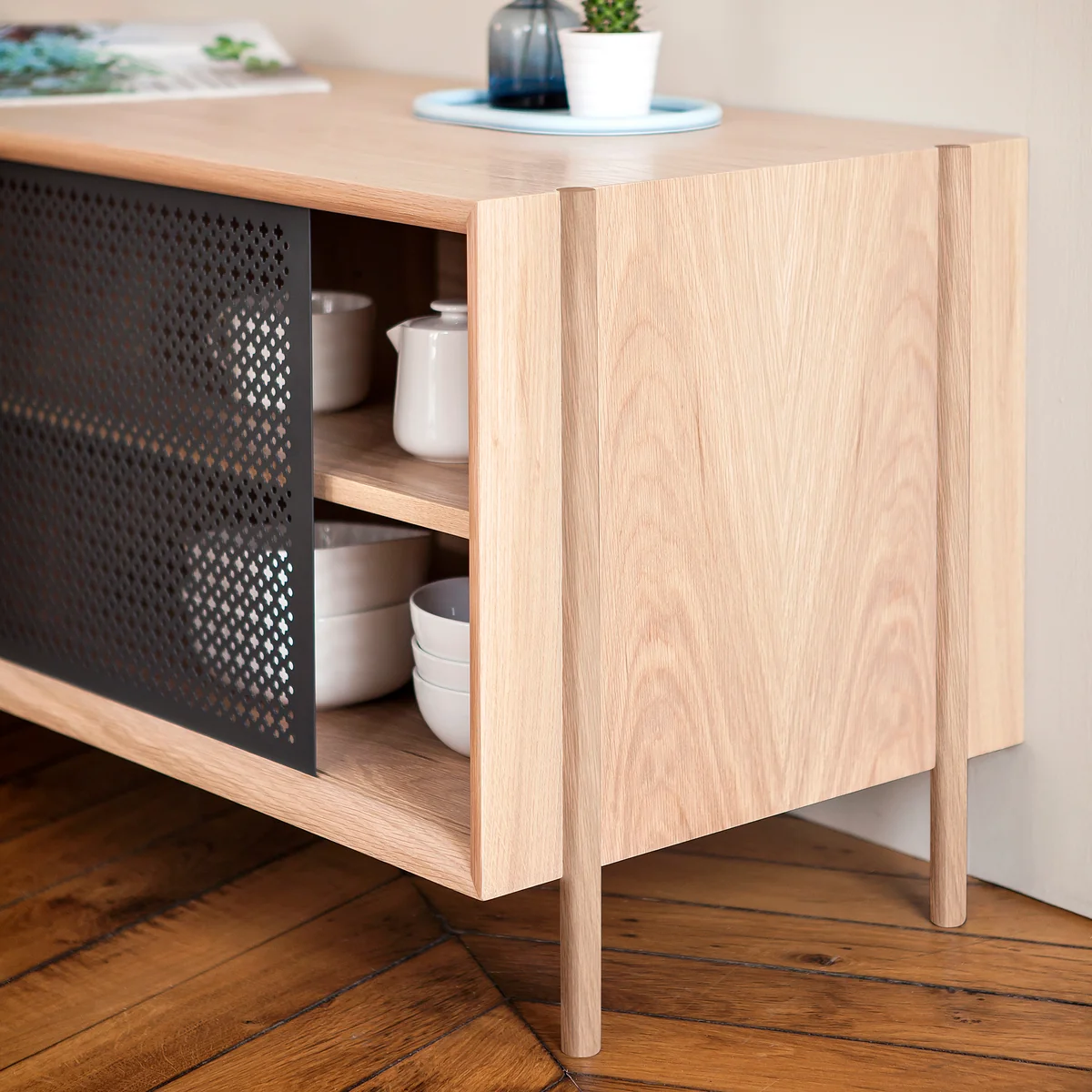 Das Gabin Sideboard des französischen Herstellers Hartô zeichnet sich durch seinen harmonischen Materialmix und die detailreiche Gestaltung aus. Der Korpus des Sideboards ist aus MDF Platten mit hochwertigem Eichen- oder Walnussholz hergestellt, während die Schiebetüren aus Stahl gefertigt sind. Diese sind mit einer filigranen Perforierung versehen, die an die Handwerkskunst des Korbflechtens erinnert.
