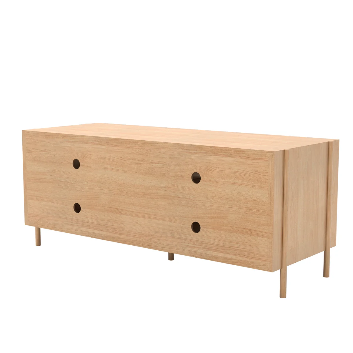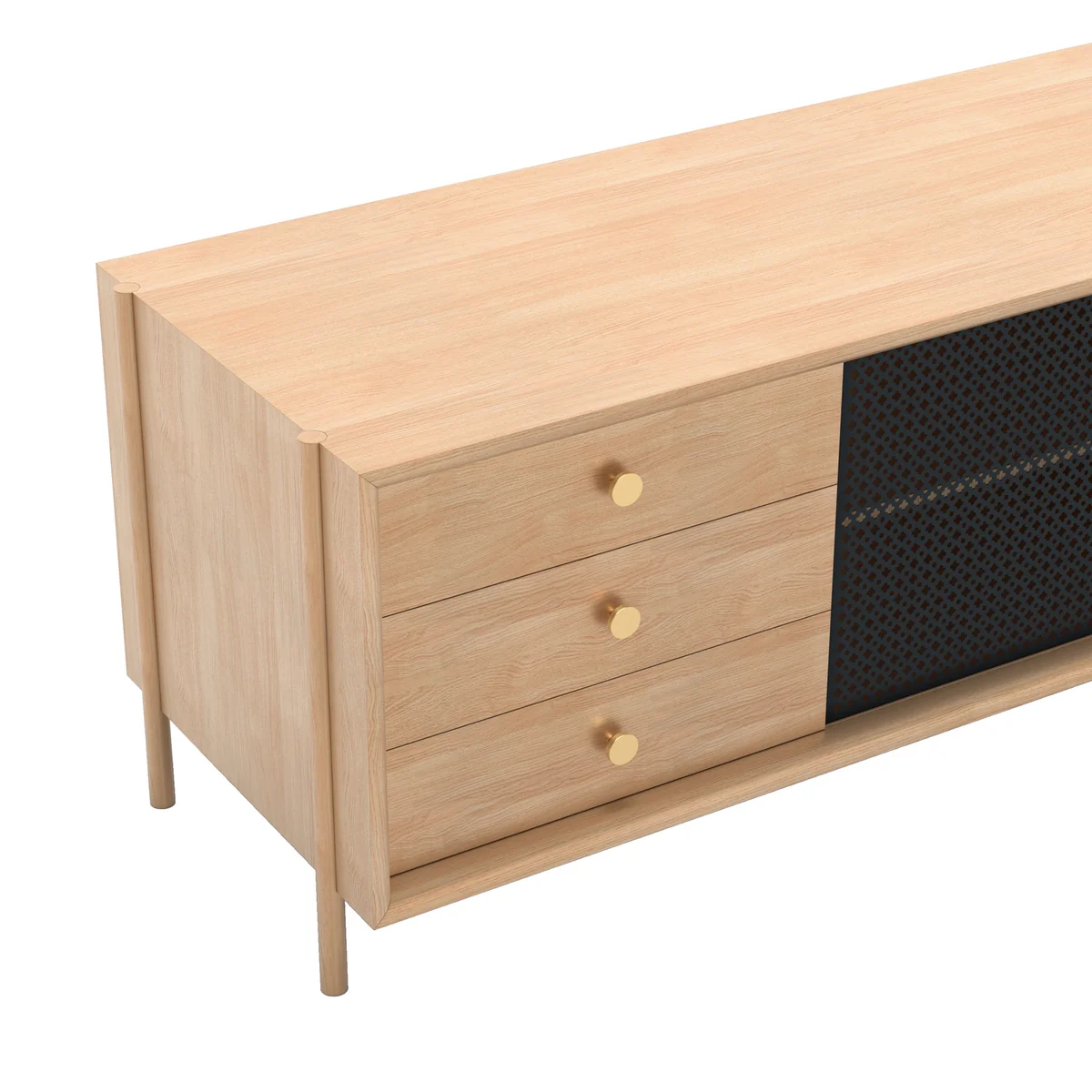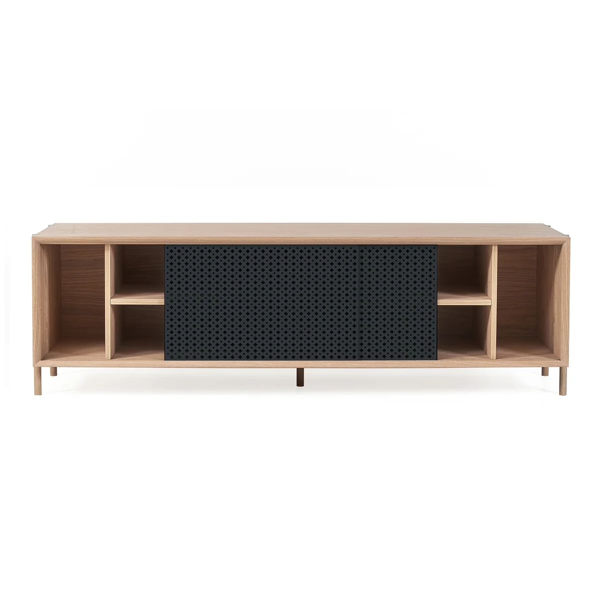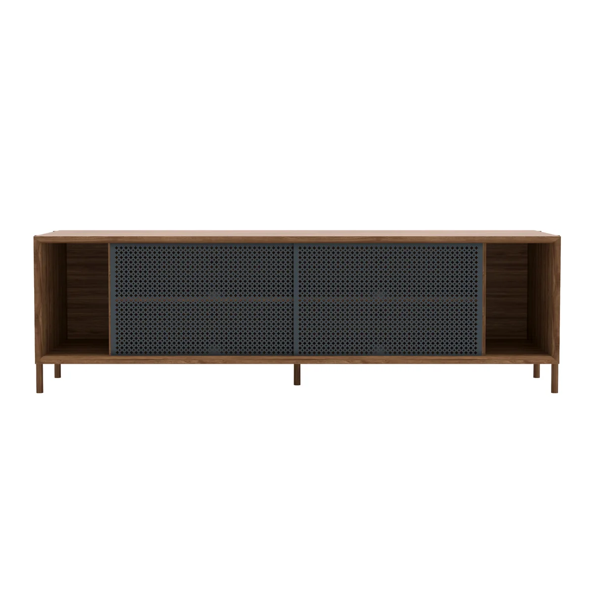 Das Gabin Sideboard des französischen Herstellers Hartô zeichnet sich durch seinen harmonischen Materialmix und die detailreiche Gestaltung aus. Der Korpus des Sideboards ist aus MDF Platten mit hochwertigem Eichen- oder Walnussholz hergestellt, während die Schiebetüren aus Stahl gefertigt sind. Diese sind mit einer filigranen Perforierung versehen, die an die Handwerkskunst des Korbflechtens erinnert.