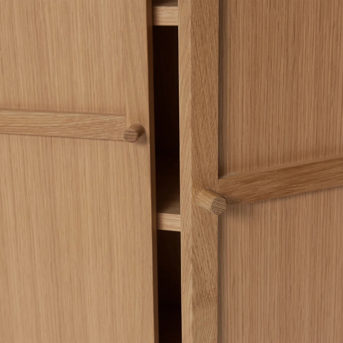 Gefertigt aus FSC®-zertifiziertem Eichenholz, zeichnet sich der Schrank durch seine Robustheit und Haltbarkeit aus. Die Abnutzung dieses besonderen Holzes ist gering - somit kann der Schrank über mehrere Jahre verwendet werden.