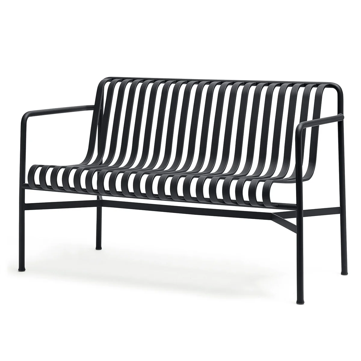 Die Palissade Dining Bank von HAY ist eine Gartenbank, die sich hervorragend für gemütliche Grillabende im Garten eignet. Mit der Rücken- und den Armlehnen bietet die Bank einen hohen Komfort. Dabei erlaubt die ergonomische Form der Bank - auch ohne Polsterung - ein bequemes Zurücklehnen.