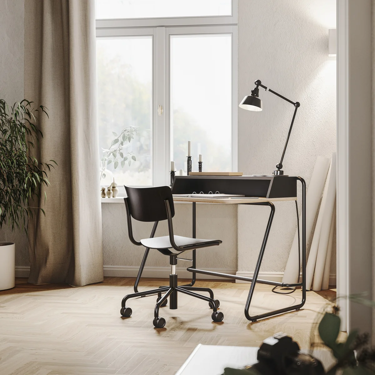 Der S 43 DR Bürostuhl von Thonet ist der optimale Arbeitsstuhl für alle, die auf der Suche sind nach einem nachhaltigen Designprodukt mit Mehrwert. Erstmals als „hinterbeinloser Kragstuhl“ S 43 von Mart Stam im Jahr 1931 entworfen, hat das Design-Objekt mit seiner zeitlosen Gestaltung Geschichte geschrieben. Die pure, zurückhaltende Form des ursprünglichen Freischwingers lebt auch in den neuen Modellen weiter: Ästhetische wie materielle Detailreduziertheit sowie klare Linien zeichnen diesen Drehstuhl aus.