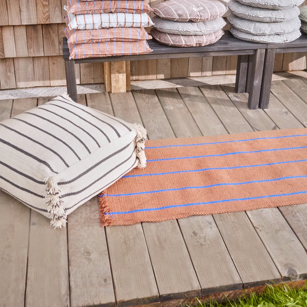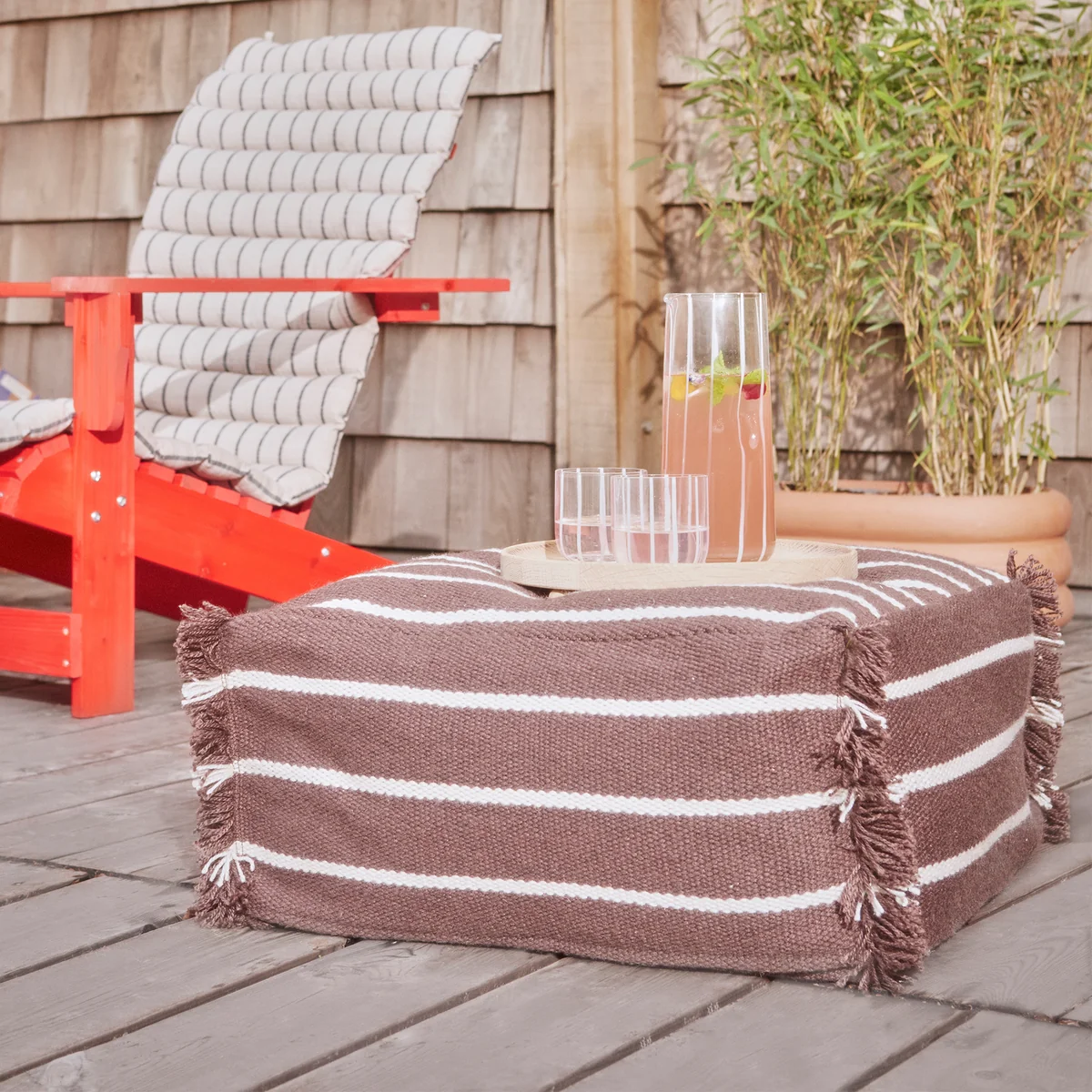 Der Lina Pouf aus recyceltem Polyester ist sowohl für den Innen- als auch für den Aussenbereich geeignet. Der Pouf hat ein einfaches Design mit Streifen und Fransen an den Seiten. Mit diesem Pouf in verschiedenen Farben kann ein persönlicher Ausdruck geschaffen werden.