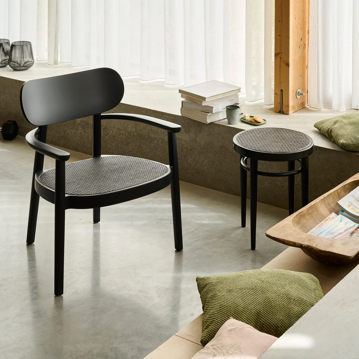 Der 214 RH Hocker von den Gebrüdern Thonet aus dem Jahre 1800 für Thonet. Bei diesem Klassiker unter den Barhockern trifft Bugholz auf Rohrgeflecht. Die Beine des Hockers werden in traditionellem Biegeverfahren aus Buchenholz gefertigt, während ein Ring aus Rohrgeflecht dem Barhocker zusätzliche Stabilität verleiht und als Fussstütze für höheren Sitzkomfort sorgt. Die runde Sitzfläche ist als geschmeidiger Muldensitz erhältlich. Das robuste Holz macht den Hocker zu einem alltagsfähigen und geselligen Begleiter, ob zu Hause oder in der Gaststätte.