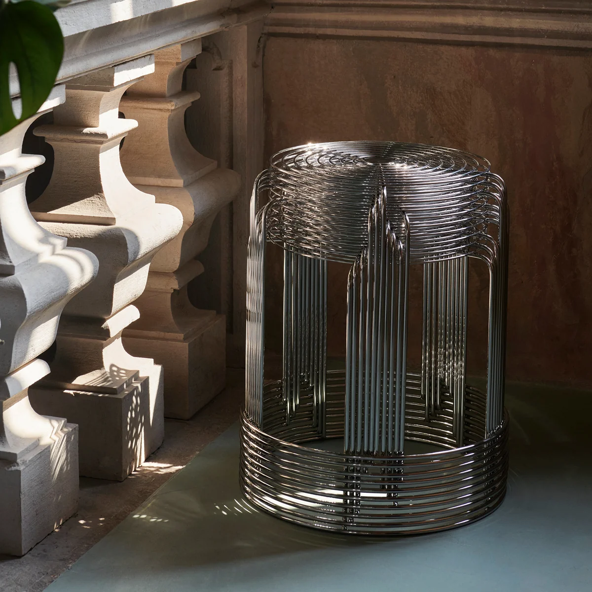 Der Wire Hocker VP11 von &Tradition verkörpert Verner Pantons Vorliebe für geometrische Formen und Draht als visuelles Element. Ursprünglich wurde Wire im Jahre1981 auf den Markt gebracht. Die Neuauflage des leichten, stapelbaren Hockers dient auch als vielseitiger Beistelltisch.