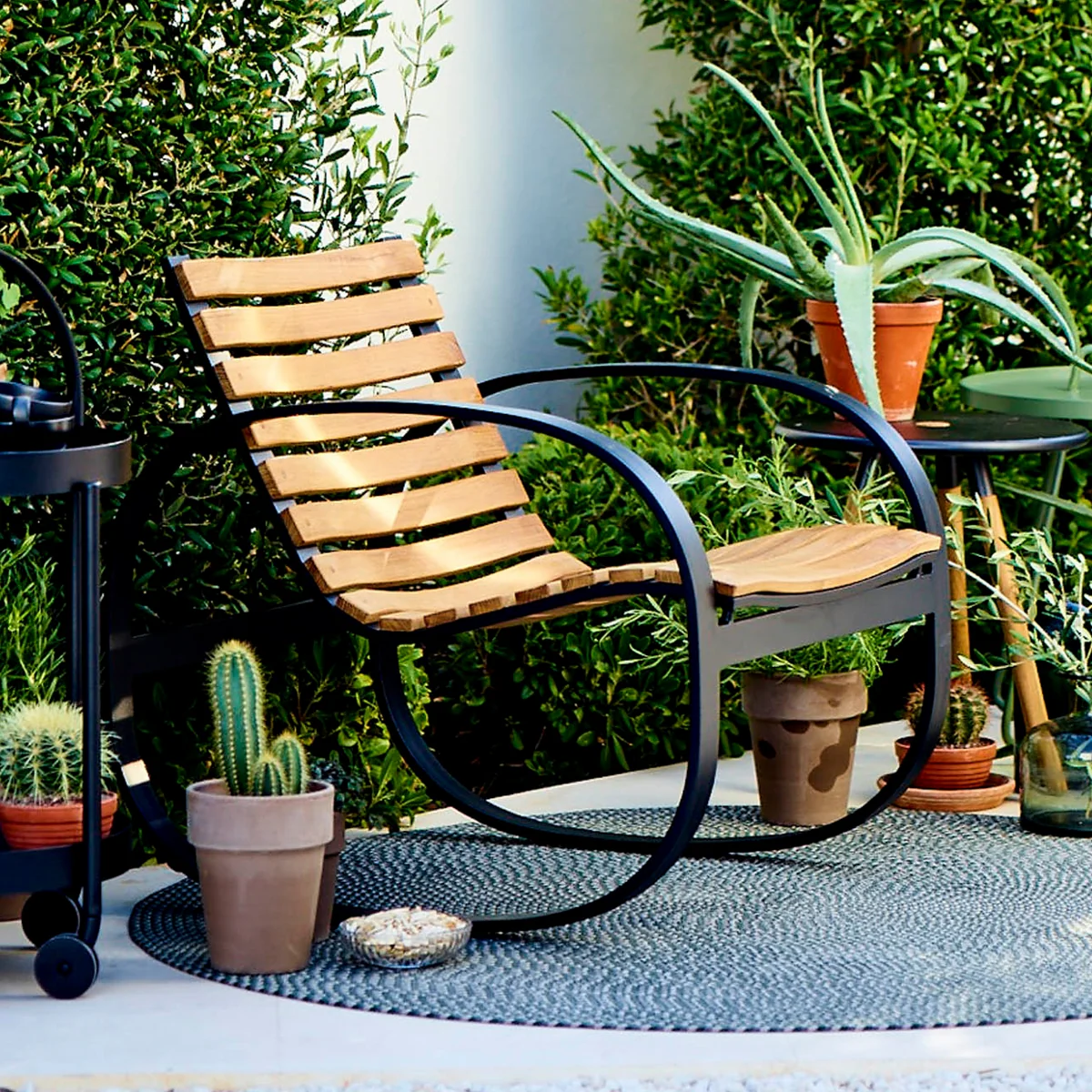 Der Schaukelstuhl wird aus zertifiziertem Teakholz und pulverlackiertem Aluminium hergestellt, welches eine wiederstandfähige Oberfläche garantiert.