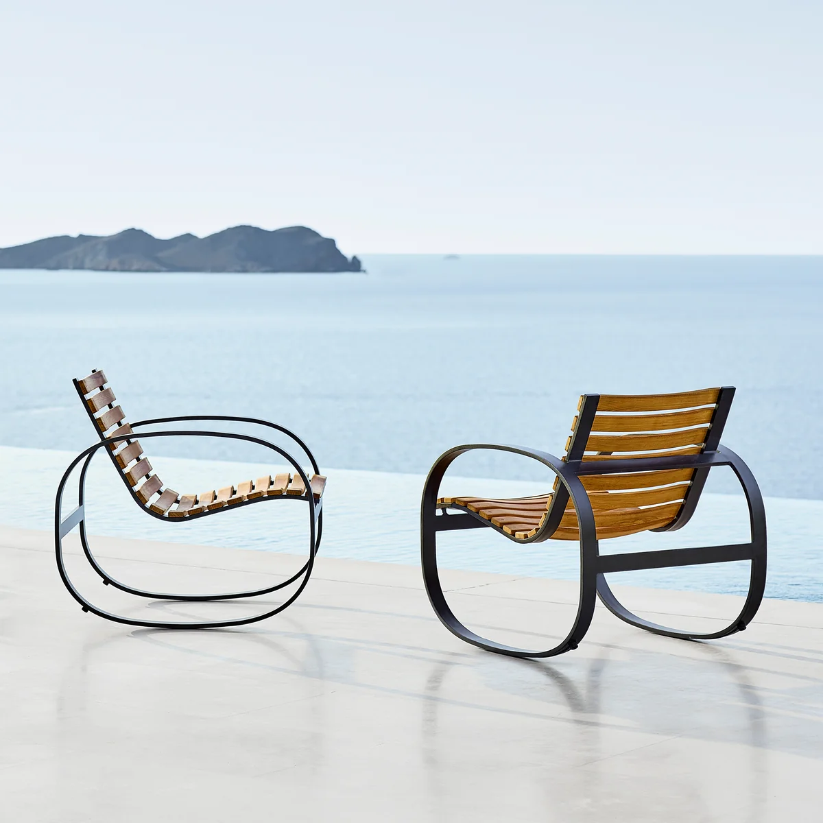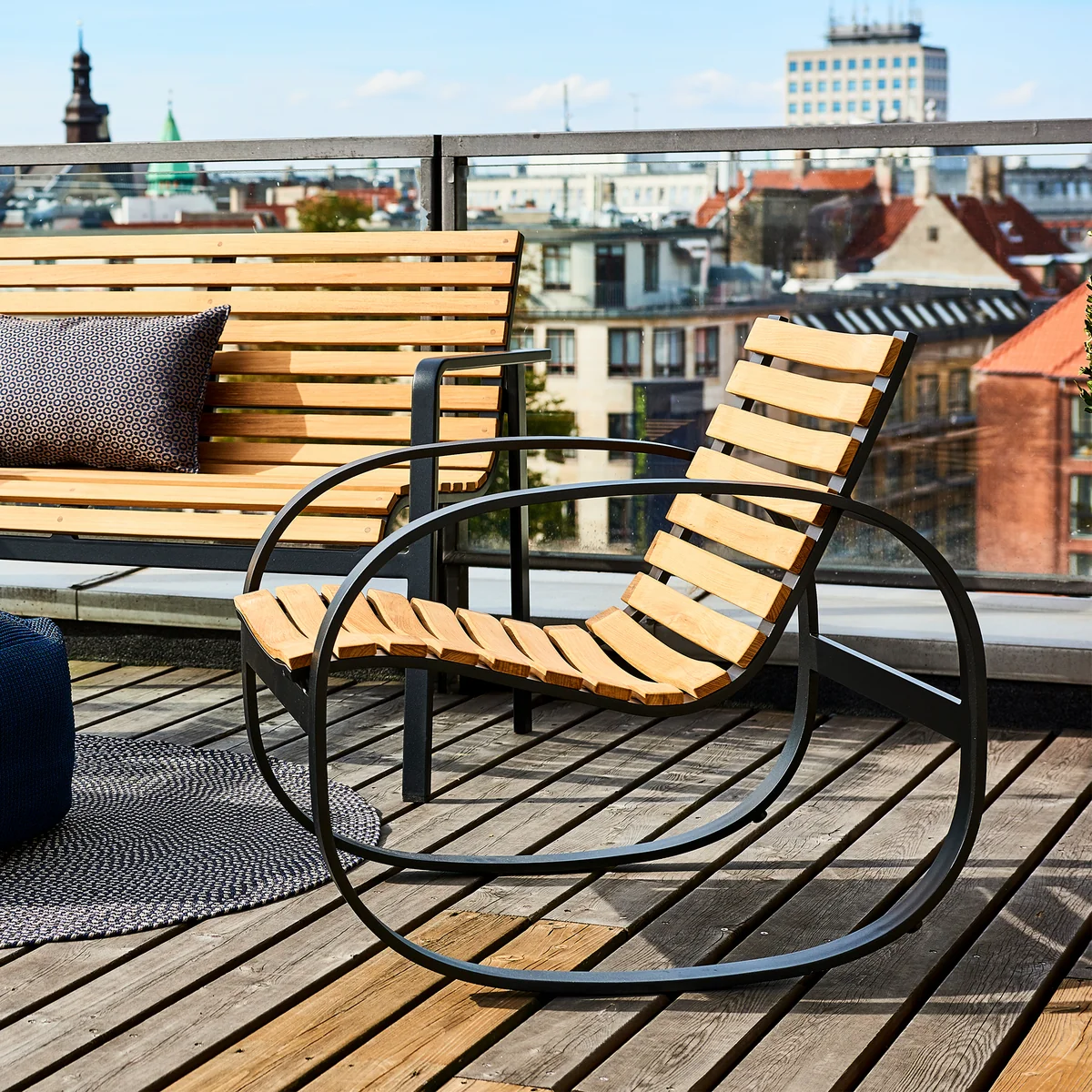 Seine gebogenen Holzleisten passen sich der Körperform an und verleihen dem Schaukelstuhl ein hohes Maβ an Komfort. Das sanfte Hin- und Herschaukeln beruhigt den Geist und sorgt für pure Gelassenheit – ob auf der Dachterrasse oder im Garten. Selbstverständlich kann Parc auch im Inneren des Hauses platziert werden.