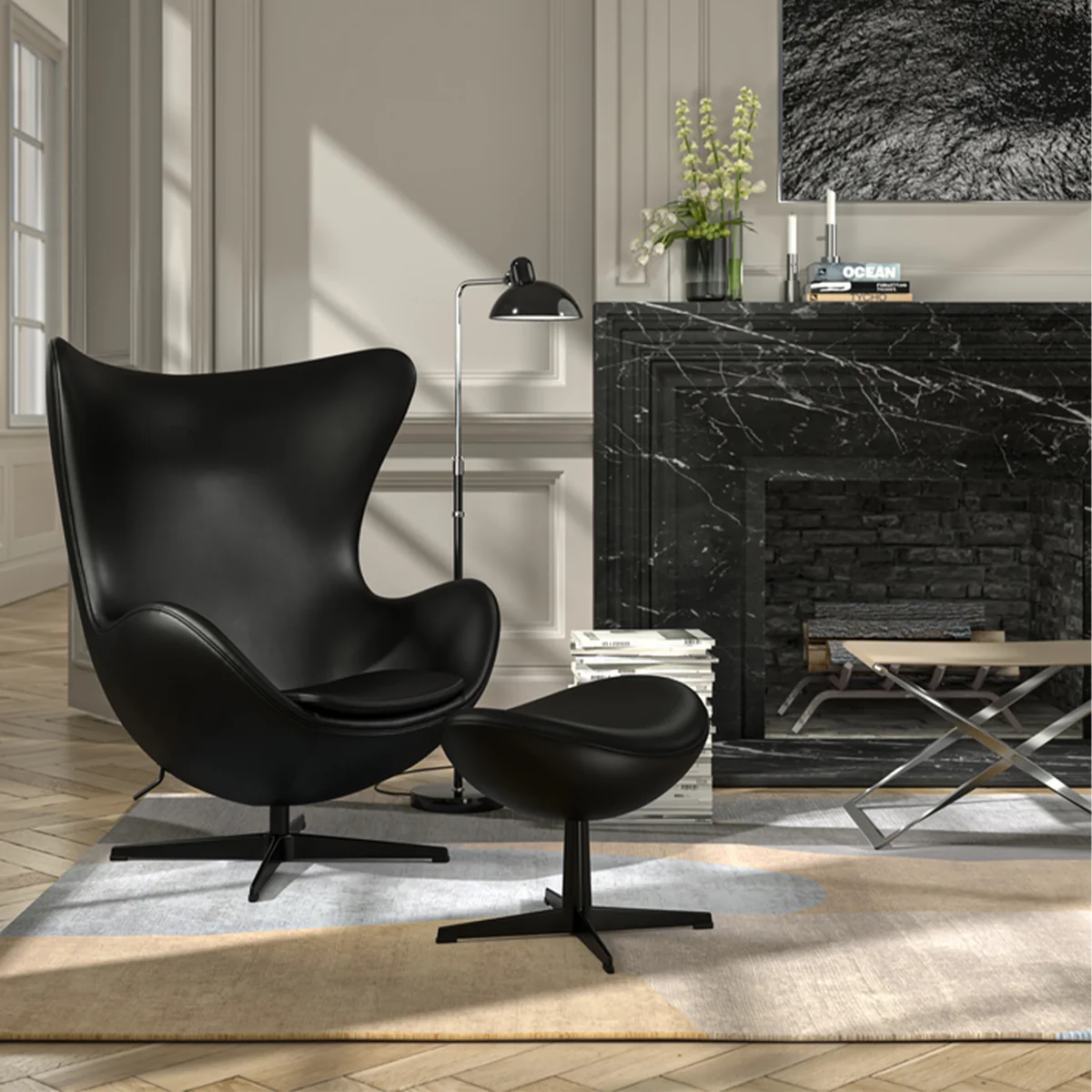 Der Egg Chair von Fritz Hansen ist in weiteren Varianten und Farben sowie mit passendem Fusshocker erhältlich.