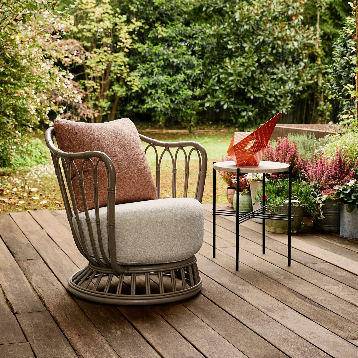 Der Grace Outdoor Lounge Chair, ursprünglich 1936 von Tove Kindt-Larsen entworfen, zählt heute zu den Highlights der Gubi Kollektion. Die neue Outdoor-Variante überträgt ihre skulpturale Eleganz und naturnahe Ästhetik in den Aussenbereich – modern interpretiert mit wetterfestem, synthetischem Rattan, das auf einem pulverbeschichteten Aluminiumrahmen geflochten ist. Trotz seiner robusten Bauweise bleibt der Grace Outdoor Lounge Chair leicht und flexibel einsetzbar – sei es auf der Terrasse, im Wintergarten oder sogar im Innenbereich. Erhältlich in Schwarz, Weiss und Grau, ist er mit einem tiefen, wetterfest bezogenen Sitzkissen ausgestattet, das für Komfort und Stil bei jedem Wetter sorgt.