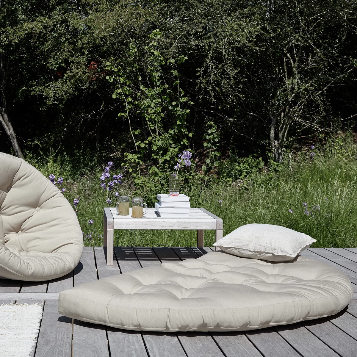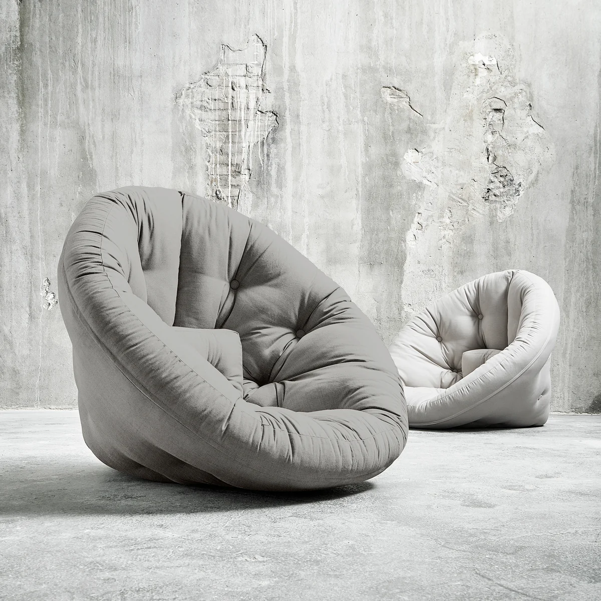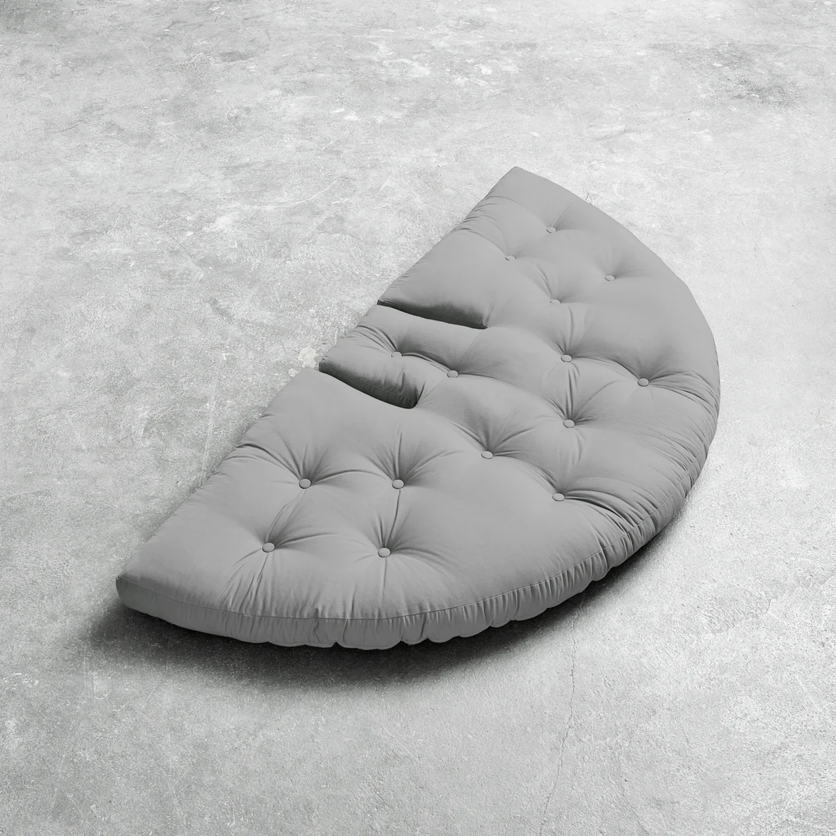 Nido von Karup Design ist ein Futon in Form eines Halbkreises, der mithilfe von vier Klettverschlüssen in wenigen Handgriffen zum bequemen Sessel werden kann. Beide Varianten laden zum Meditieren, Faulenzen, Lesen und Schlafen ein.