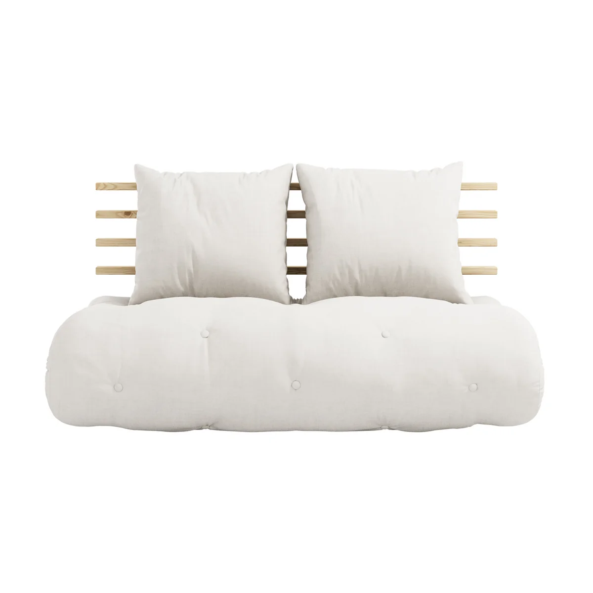 Das Shin Sano Sofa von Karup überzeugt durch zeitlosen Minimalismus und raffinierte Funktionen. Das Sofa verfügt über eine bequeme, dicke Futon-Matratze aus 15 cm Recycling-Mischfaser mit einem Kern aus 4 cm Schaumstoff, die von einem stilvollen Lattenrost aus Kiefernholz auf der Rückseite umgeben ist. Zieht man den Futon flach heraus, hat man in Sekundenschnelle ein schönes, grosses Gästebett mit Kopfteil und zwei bequemen Kissen zum Anlehnen.