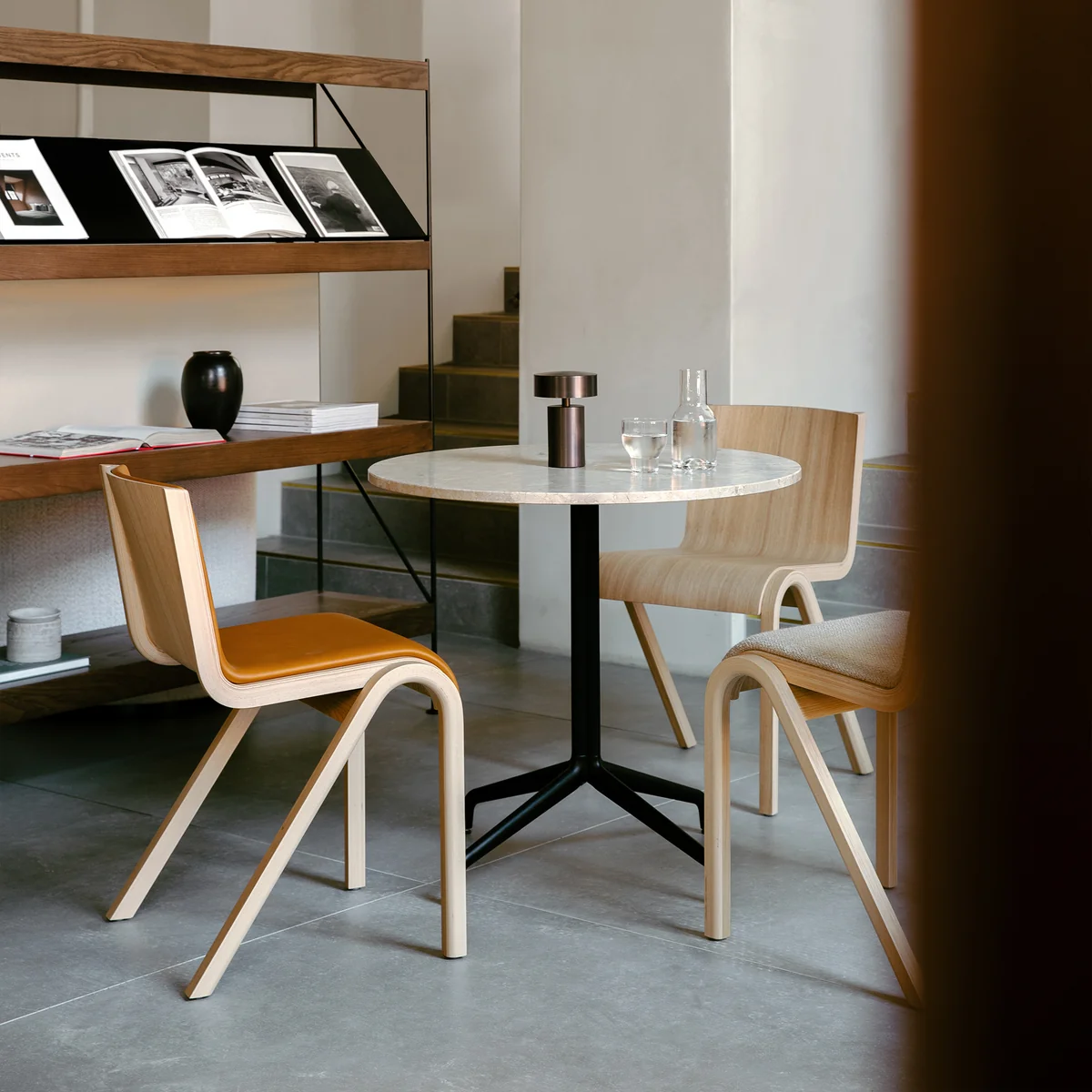 Der Ready Dining Chair von Audo wird aus Buchenholz und Eichenfurnier mit dem FSC®-Siegel gefertigt. Er ist in verschiedenen Farben und als Vollpolster-Variante erhältlich. Darüber hinaus lassen sich bis zu 10 der Stühle stapeln.