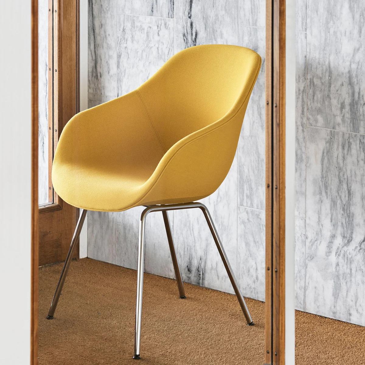 Ausgestattet mit einem vierbeinigen Stahlrahmen und schlanken Beinen, die leicht nach aussen abgewinkelt sind, besitzt der AAC 127 einen eleganten Ausdruck. Das Gestell ist in verchromter und pulverbeschichteter Ausführung erhältlich und die Schale in einer Vielzahl von Polsteroptionen, die jedem Geschmack entsprechen. Dank seiner hohen Rückenlehne und den Armlehnen verspricht der Stuhl einen hohen Komfort, sodass sich angenehme Stunden beim Arbeiten und Essen darauf verbringen lassen.