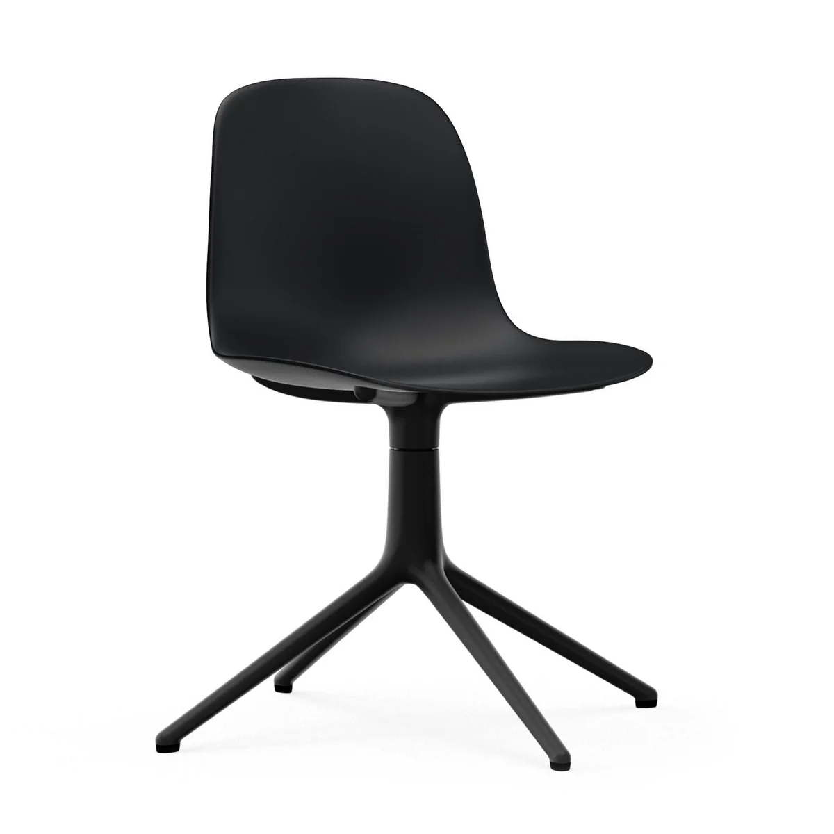 Die typische Sitzschale der Form Serie wird auch bei dem Drehstuhl aus Polypropylen in verschiedenen Farben hergestellt, während das Form Drehgestell in Schwarz, Weiss und poliertem Aluminium erhältlich ist. Das Gestell hält die Sitzschale mit schlanken Armen, die in der Mitte aufeinandertreffen und zu vier Stuhlbeinen werden.