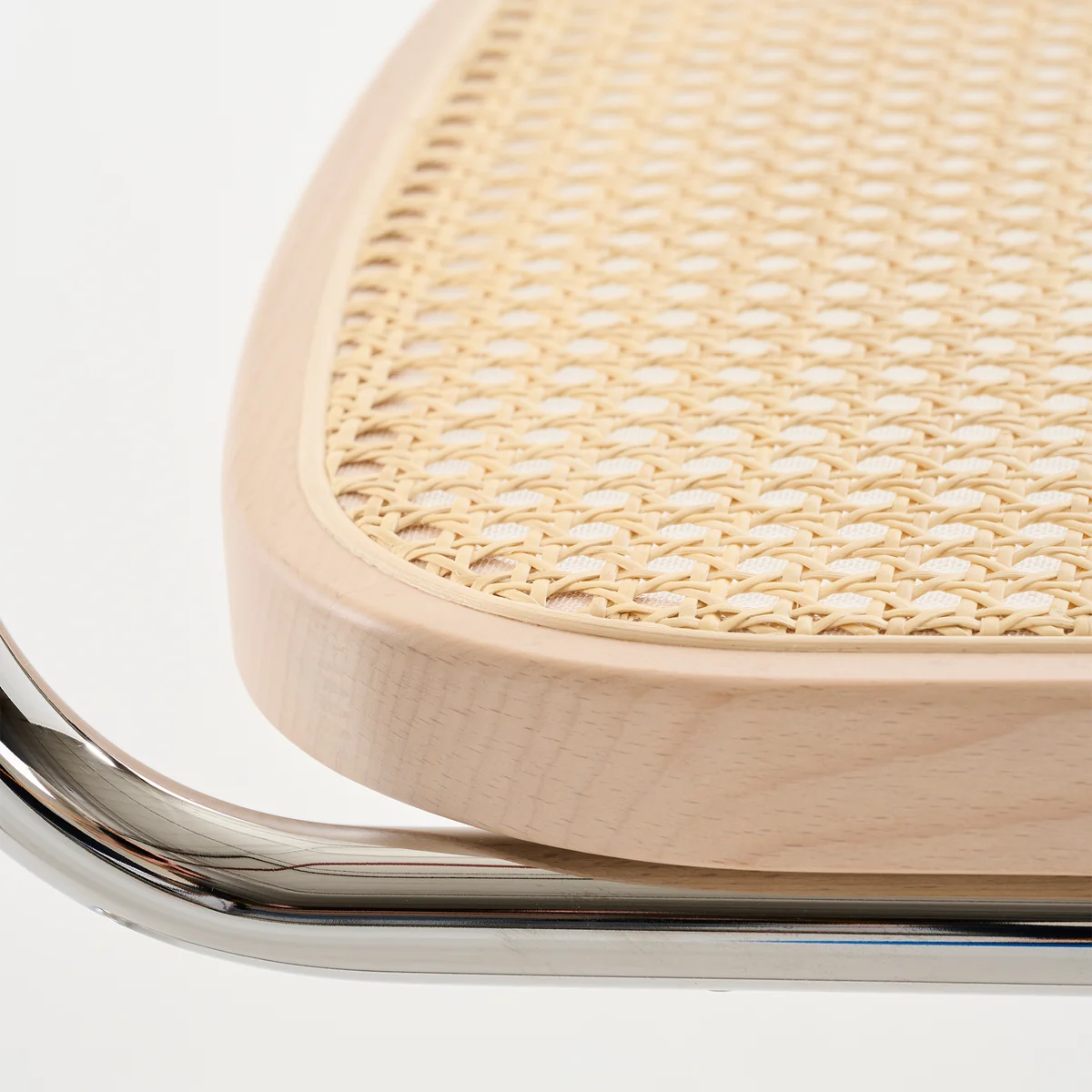 Die Besonderheit des S 32 Lounge besteht darin, dass er die typischen Eigenschaften eines Freischwingers mit den gestalterischen Merkmalen eines Lounge-Möbels verbindet. Die Sitzfläche wurde für maximale Ergonomie grosszügig erweitert (58 cm) und leicht nach hinten geneigt. Ohne Armlehnen ermöglicht dieser Loungesessel eine kommunikative Atmosphäre, die ein entspanntes Nebeneinander und Miteinander fördert. Mit einer angenehmen Sitzhöhe von 40 cm harmoniert er perfekt mit Sofas und passt hervorragend in verschiedene Raumkonzepte. Im Vergleich zu gepolsterten Sesseln überzeugt der S 32 Lounge durch seine formale Leichtigkeit und kompakten Masse, sodass er sich nicht dominant in den Raum drängt, sondern durch sein luftiges Stahlrohrgestell eine transparente und grosszügige Aura verströmt.