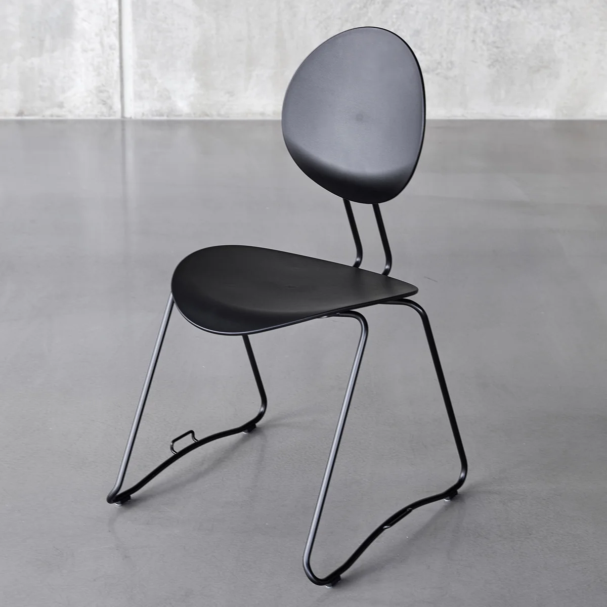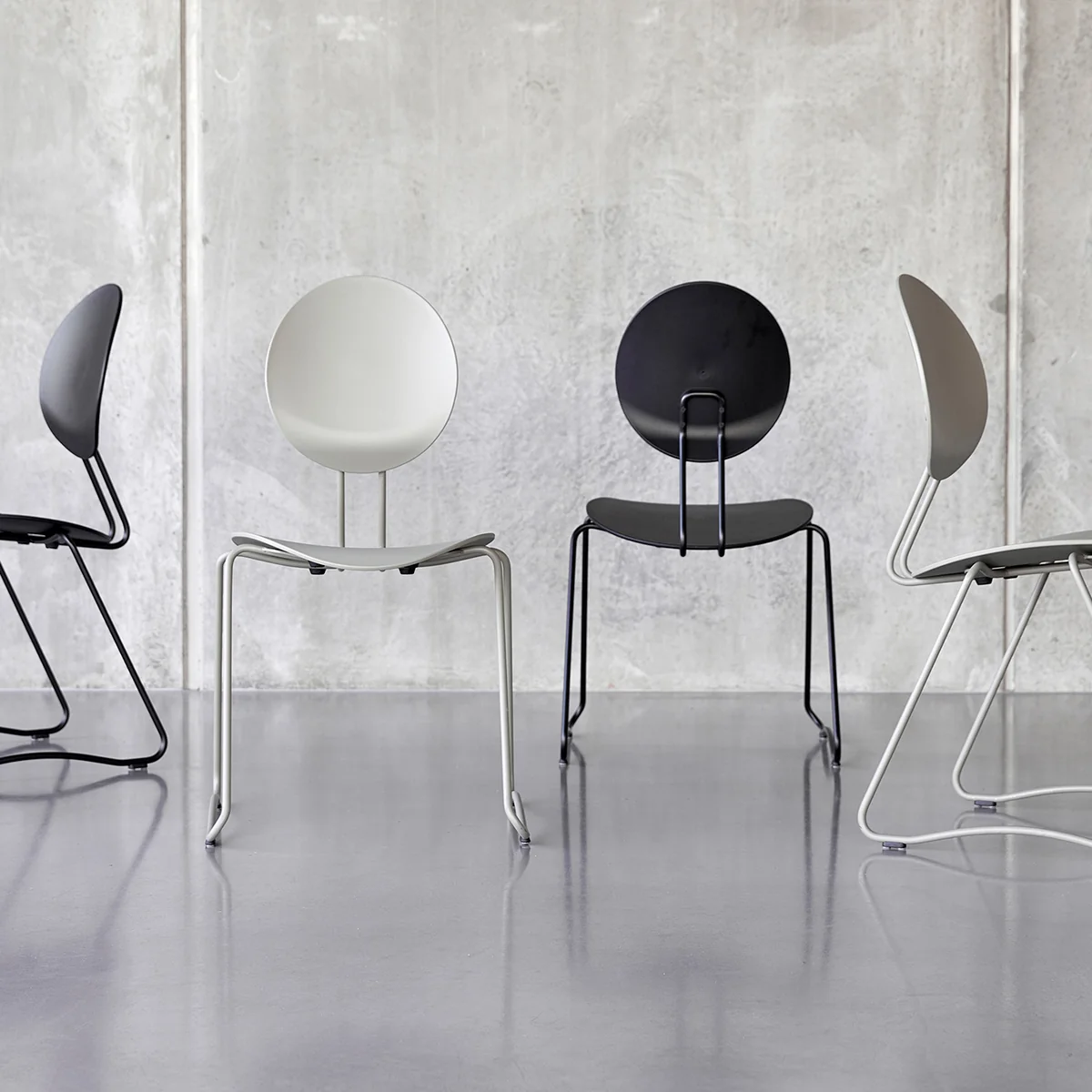 Das Design des Stuhls ist geprägt von einem zungenförmigen Sitz und einer sanft geschwungenen Rückenlehne, die sich perfekt der Körperform anpasst. Sitz und Rückenlehne bestehen aus 100% recycelbarem Polypropylen (PP), einem Material, das für seine angenehme Oberfläche, hohe Haltbarkeit und Kratzfestigkeit bekannt ist. Der Sitz thront auf einem pulverbeschichteten Kufenstahlgestell, das besonders filigran wirkt.