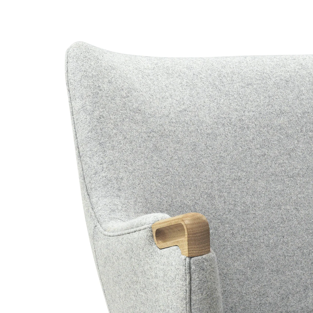 Die ebenfalls gepolsterten Armlehnen sorgen für zusätzlichen Komfort und sind mit elegant abgerundeten Massivholzgriffen versehen, die eine natürliche Note einbringen. Das verwendete Holz wird erneut bei den Beinen aufgegriffen: Sie werden wahlweise aus Walnuss oder Eichenholz gearbeitet und zeichnen sich durch ihre leicht konisch zulaufende Form aus, die der Gesamterscheinung eine gewisse Leichtigkeit verleiht.