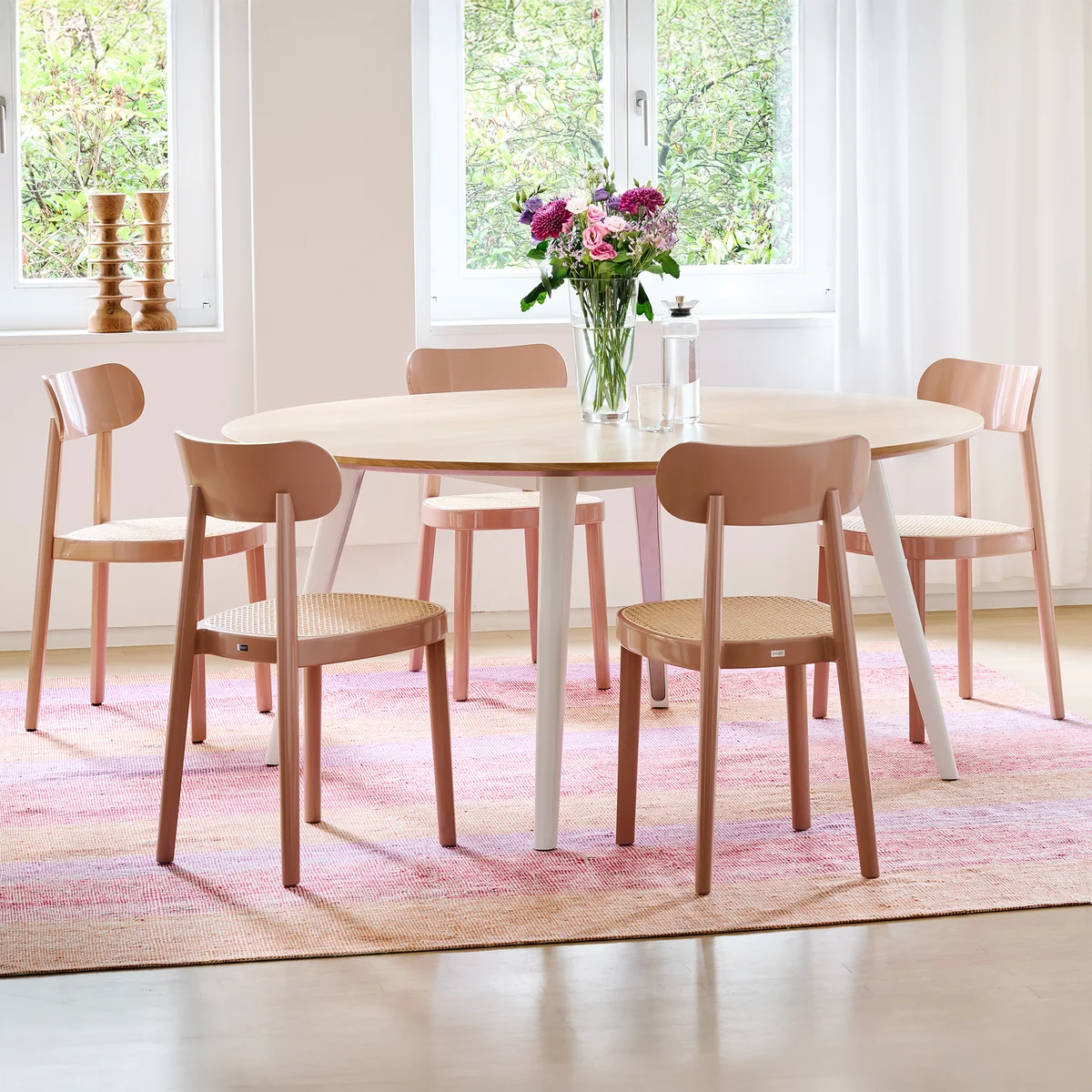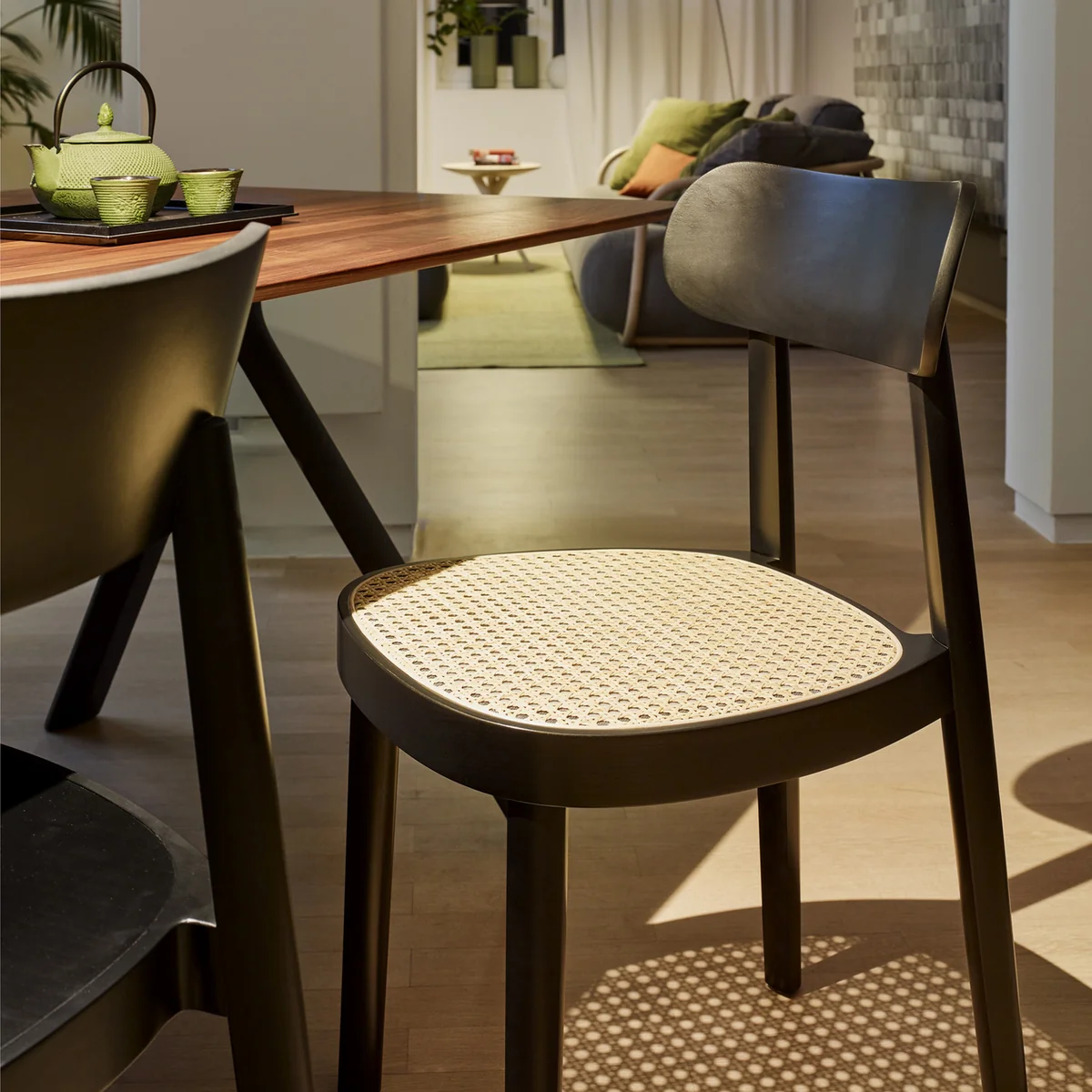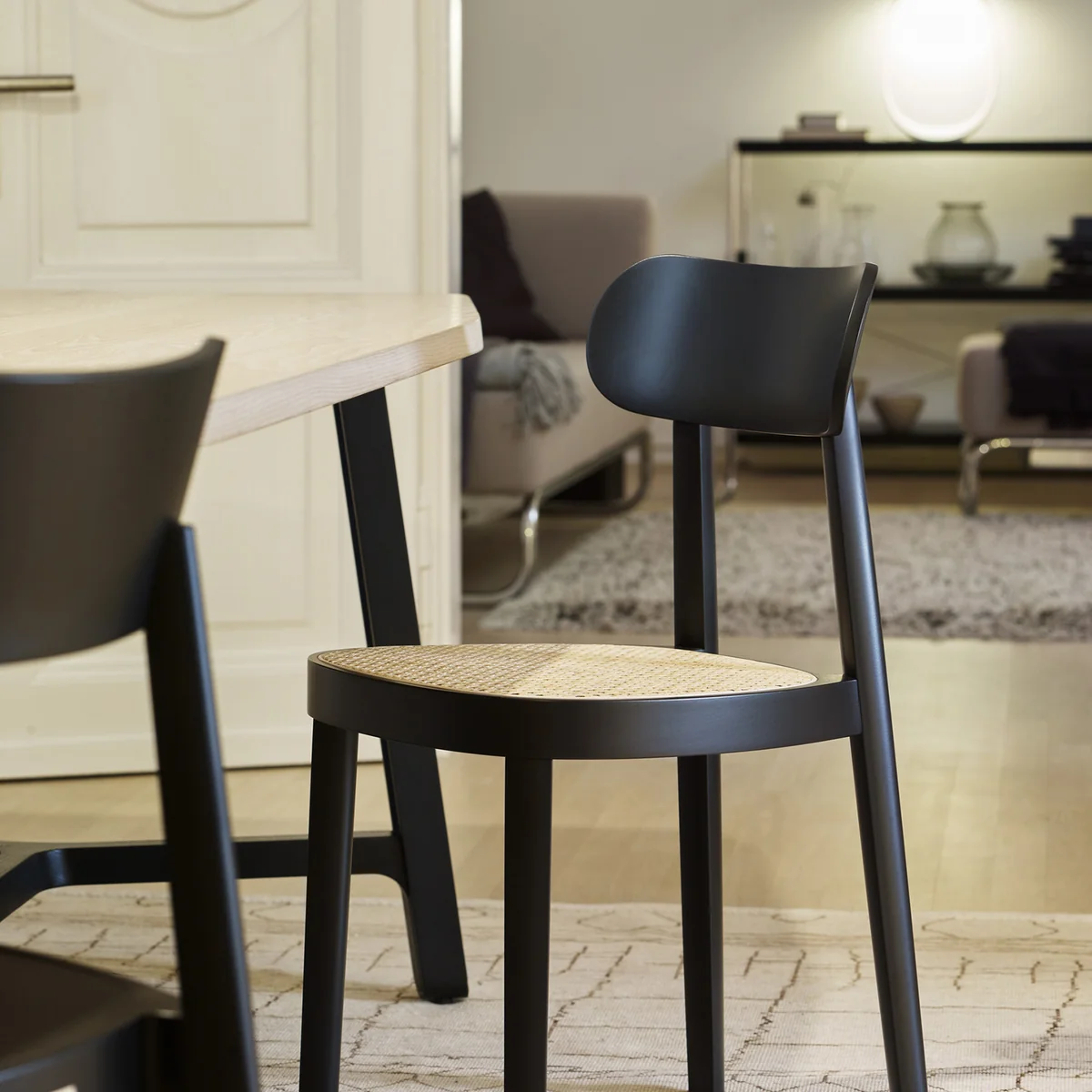 Der zeitlose 118 Stuhl bezieht sich in seiner Form des gebogenen Sitzrahmens auf den 214 Bugholzstuhl. Auch die von Hand bearbeitete Sitzfläche ist mit dem ikonischen Wiener Geflecht (Rohrgeflecht) bespannt.