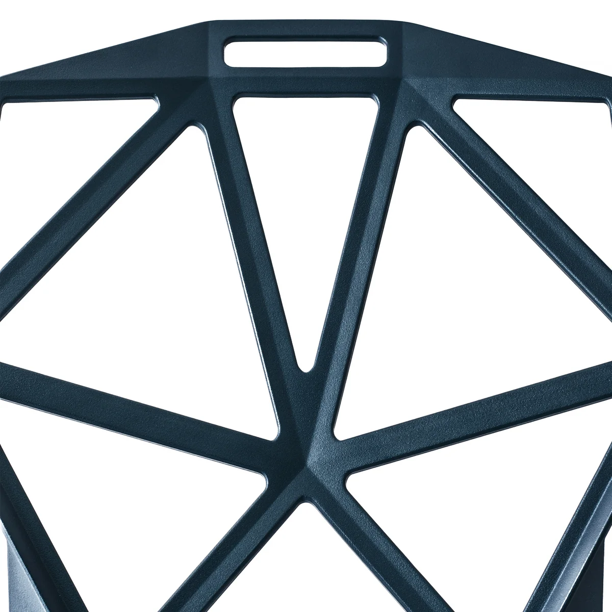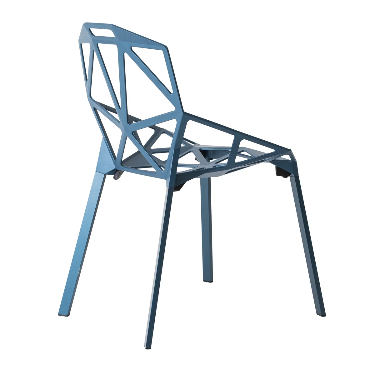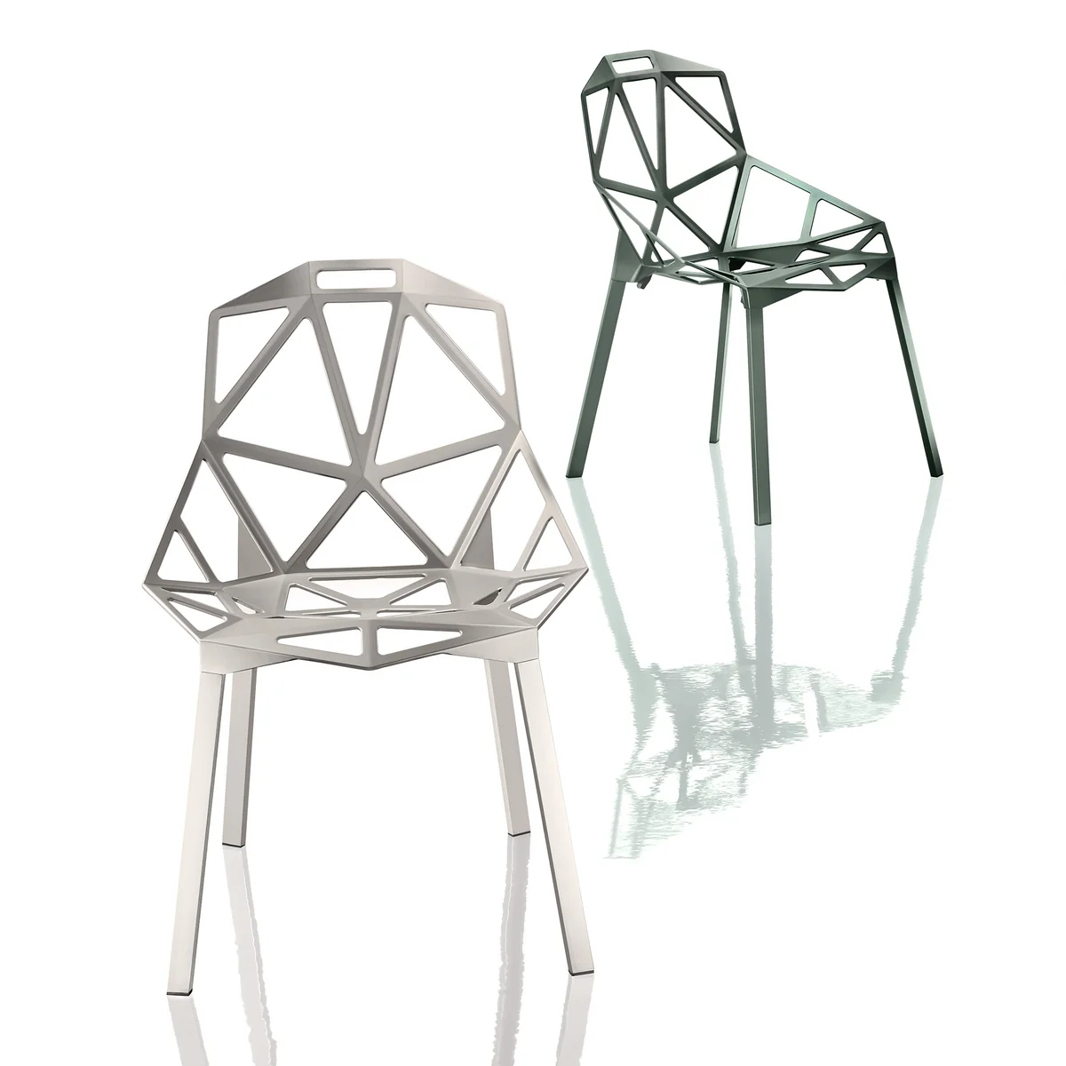 Chair One ist aber keinesfalls ein blosses avantgardistisches Sitzmöbel. Der Stuhl ist ein Zusammenspiel von Material, Formgebung und industrieller Fertigung. Er ist rostschutzbehandelt und feuerhemmend und somit prädestiniert für brandsensible Zonen und der Anwendung im Aussenbereich. Erstmals verwendete Grcic bei einer kompletten Stuhlsitzfläche Druckguss Aluminium, das zusätzlich mit fluoriertem Titan oberflächenbehandelt und mit einer Polyesterlackierung versehen ist. Für die Stuhlbeine wählte er eloxiertes Aluminium.