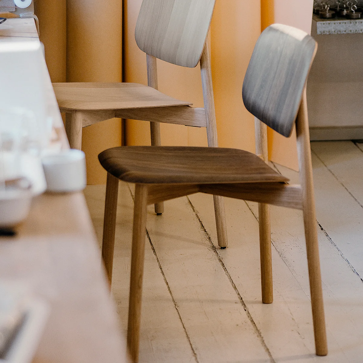 Aufgrund seines geringen Gewichts und der Stapelbarkeit eignet sich der Stuhl nicht nur für den privaten Gebrauch, sondern macht zudem in Schulen, Kantinen oder Konferenzräumen eine gute Figur. Erhältlich ist der Stuhl in einer matt lackierten Eichenversion mit Holzgestell, sowie als dunkel lackiertes Modell mit Stahlgestell.