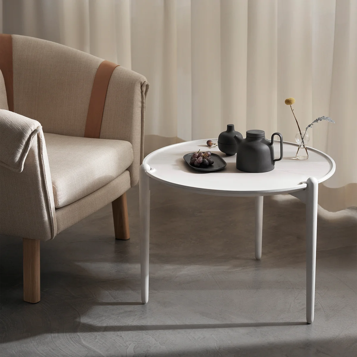 Der Aria Beistelltisch von der isländischen Designerin Dögg Guðmundsdóttir für Design House Stockholm lässt eine luftige Illusion entstehen. Die Beine und Tischplatte scheinen auf den ersten Blick getrennt zu sein - die runde Platte schwebt fast schon in der Luft. Diese Illusion entsteht durch die konisch zulaufenden Beine, die leicht über die gerahmte Platte hinausragen. Sie halten die Platte fest und schaffen so ein Gleichgewicht zwischen dem Gefühl von Schwebe und Beständigkeit.
