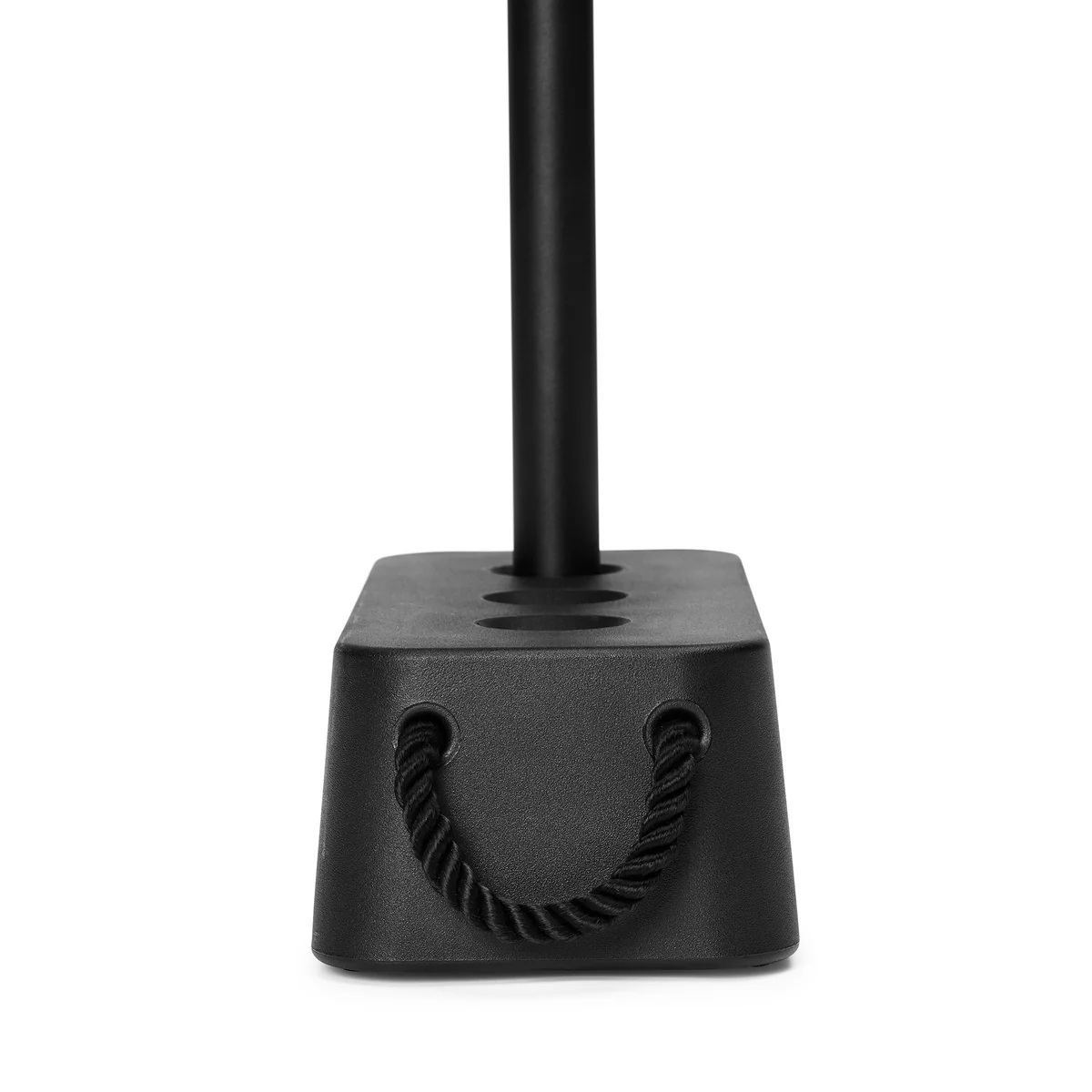 Der Standfuss erinnert an einen Bauklotz – daher der Name Brick – und ist genauso robust wie einer. Er kann vom Verwender mit Wasser oder Sand befüllt werden und sorgt dann für absolut stabilen, sicheren Halt auf jeder Art von Boden.