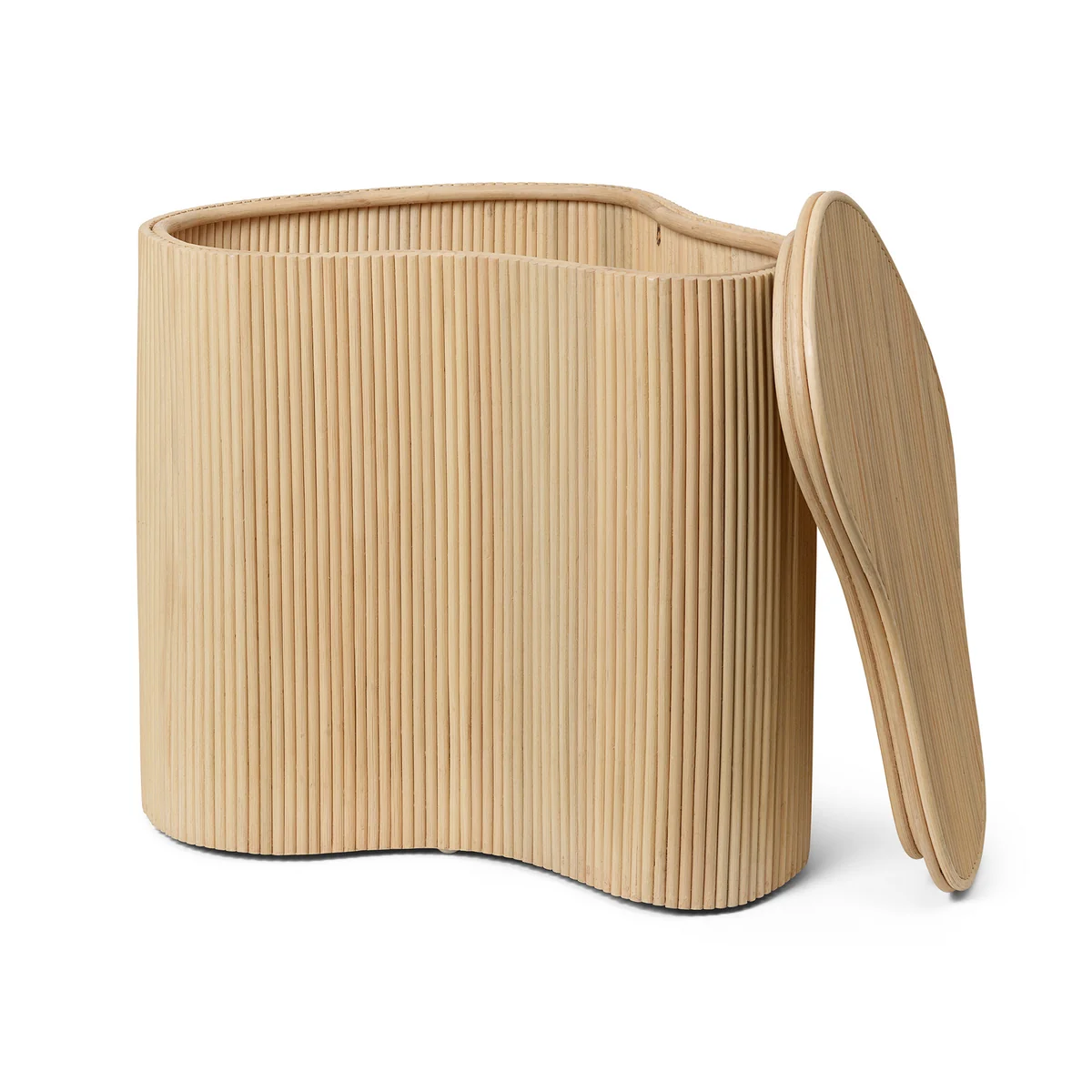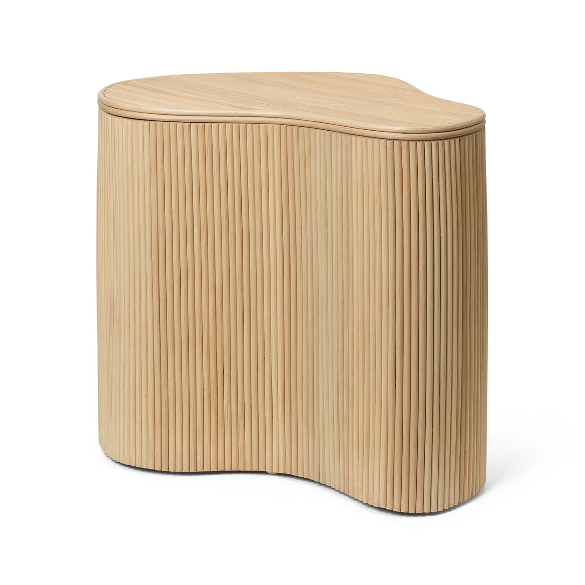 Der Isola Rattan Aufbewahrungstisch des dänischen Unternehmens Ferm Living ist in jeder Hinsicht ein Prachtstück. Seine organische Form mit abgerundeten Kanten und dem dazugehörigen Deckel, können multifunktional eingesetzt werden. Ob als Nachttisch im Schlafzimmer oder als Aufbewahrungsmöglichkeit für allerlei Spielzeuge der Kinder - der Isola Rattan Aufbewahrungstisch darf in keinem Haushalt fehlen. Isolas Innenseite wird aus MDF und Sperrholz gefertigt. Die Oberplatte und Vorderseiet werden hingegen aus Rattan handgeflochten. Zur Reinigung mit einem feuchten Tuch abwischen.