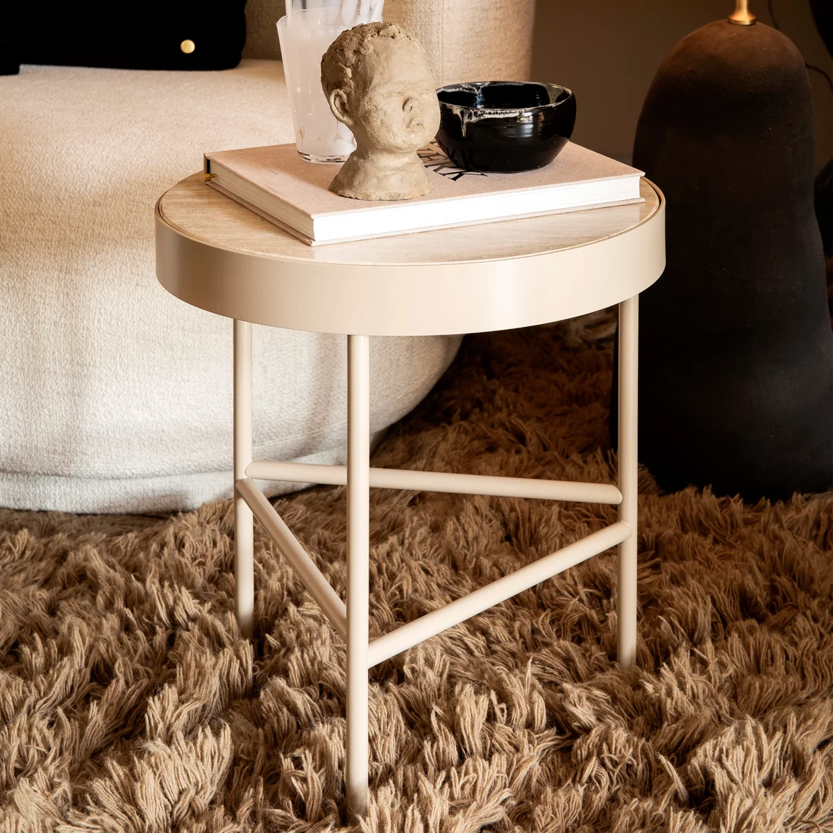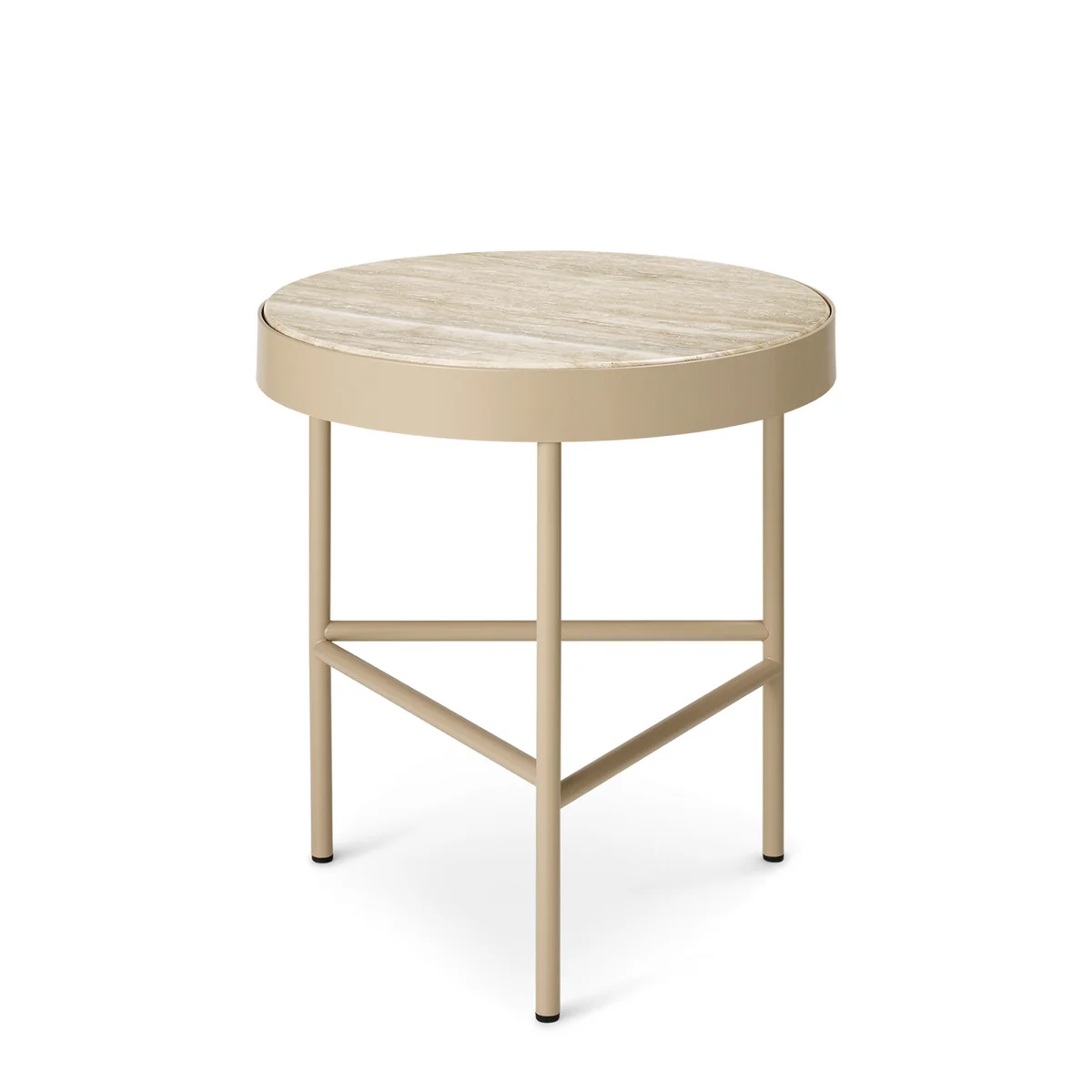 Der Travertine Couchtisch von Ferm Living ist ein edles Design-Objekt, das an jedem beliebigen Ort im Haus beeindruckend aussehen wird. Sein dreieckiges Stahlgestell kontrastiert auf stilvolle Weise mit der runden Tischplatte aus massivem Travertin-Kalkstein, was den Tisch zu einem einzigartigen Möbelstück macht. Auf der natürlichen Steinplatte werden Vasen, Coffee Table Books, aber auch Pflanzen ideal in Szene gesetzt.