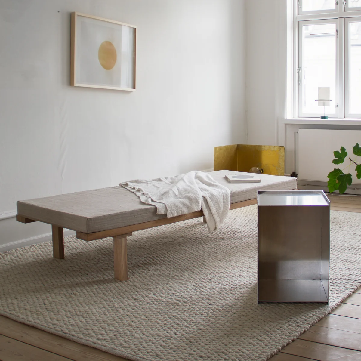 Der Rivet Box Beistelltisch wird aus Aluminium gefertigt. Das für Möbel schwierig zu bearbeitende Material wird nach traditionellem Vorbild ausgeschnitten und per Hand zum Tisch gehämmert. Die rohe, unbehandelte Oberfläche ist eine Hommage an den industriellen Charakter des Materials. Lässt sich ideal mit dem Frama Rivet Beistelltisch kombinieren.