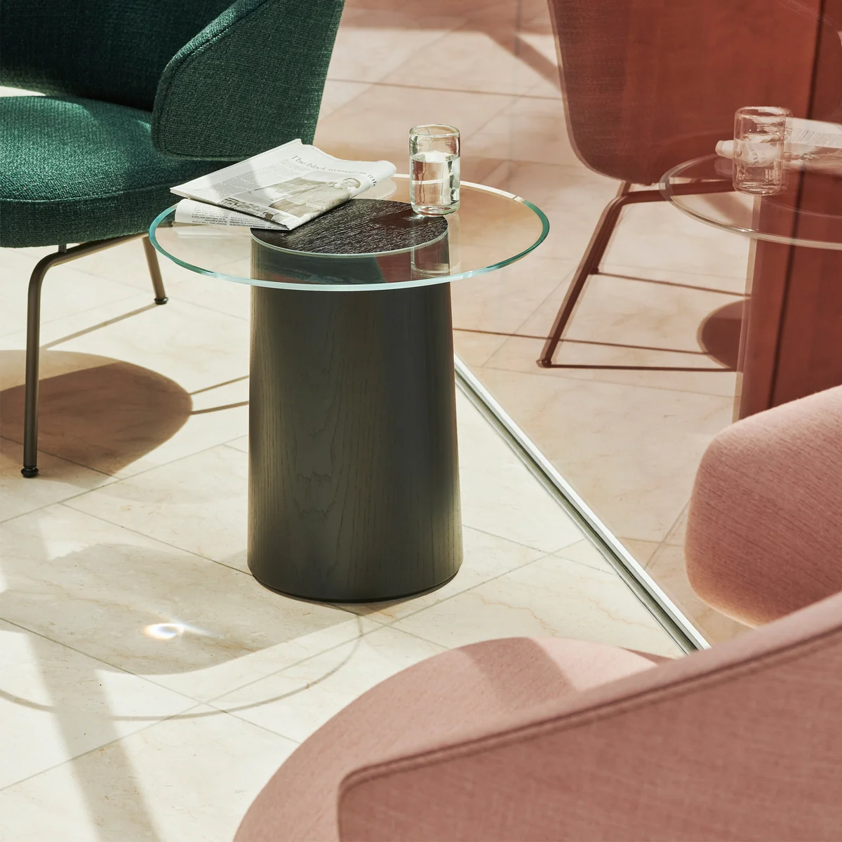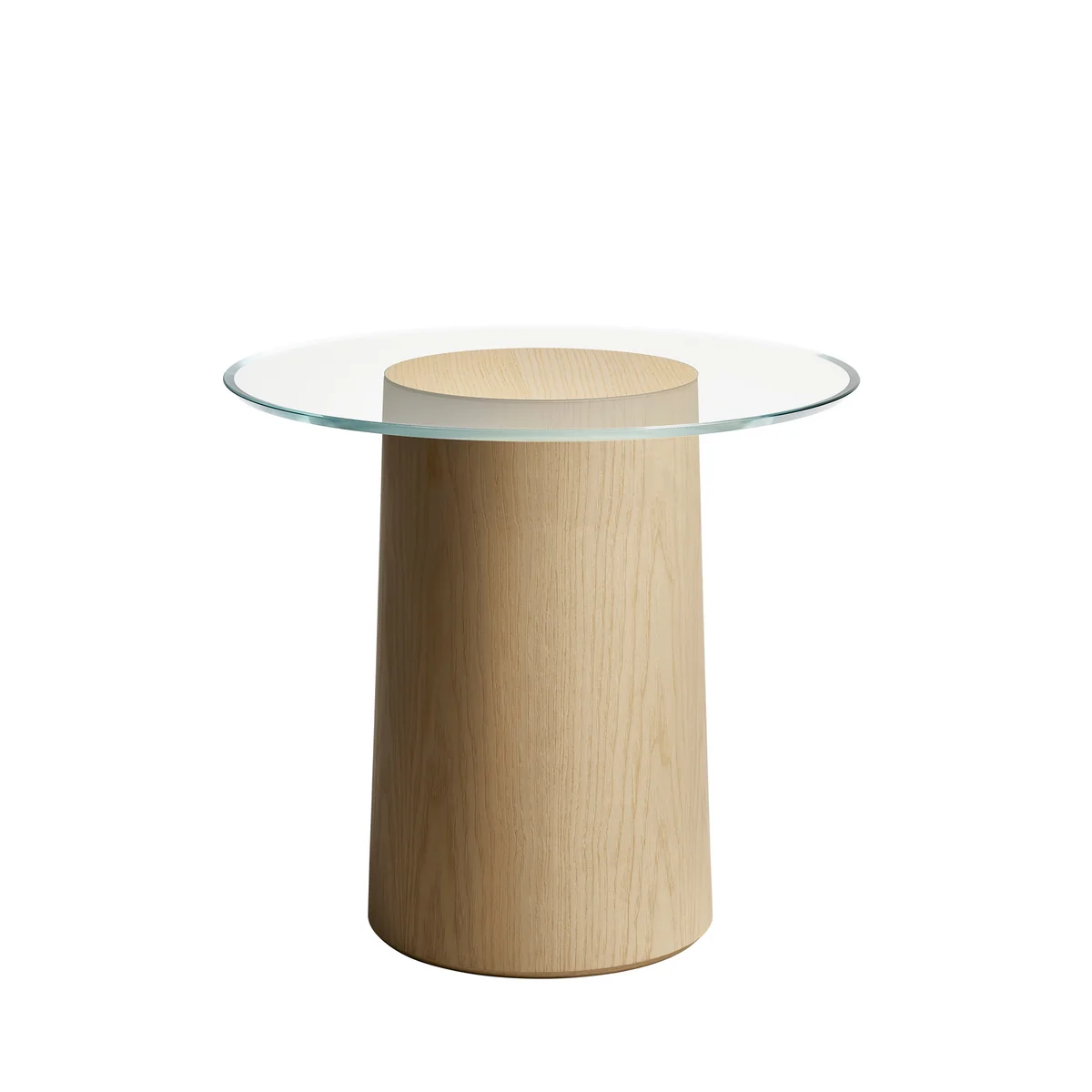 Inspiriert von Landschaften mit Holzstümpfen hat Stub (dänisch für „Stumpf“) einen transparenten Glaskreis, der ohne sichtbare Schrauben oder Halterungen über der Basis schwebt. So entsteht eine besonders dekorative und zugleich praktische Ablagefläche, die für Leichtigkeit sorgt.