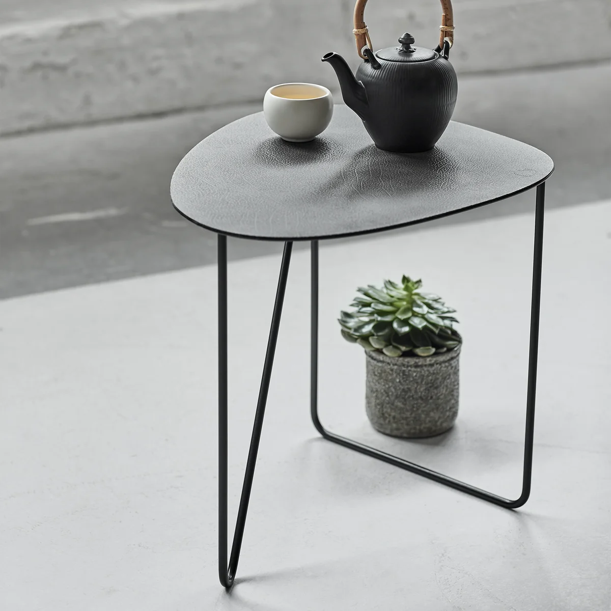 Der Curve Beistelltisch besteht aus einem filigranen Gestell aus pulverbeschichtetem Stahl. Die angewinkelten Beine verleihen dem ansonsten minimalistischen Design einen unverwechselbaren Charakter. Die Tischplatte in der Curve Form ist mit recyceltem Leder überzogen.