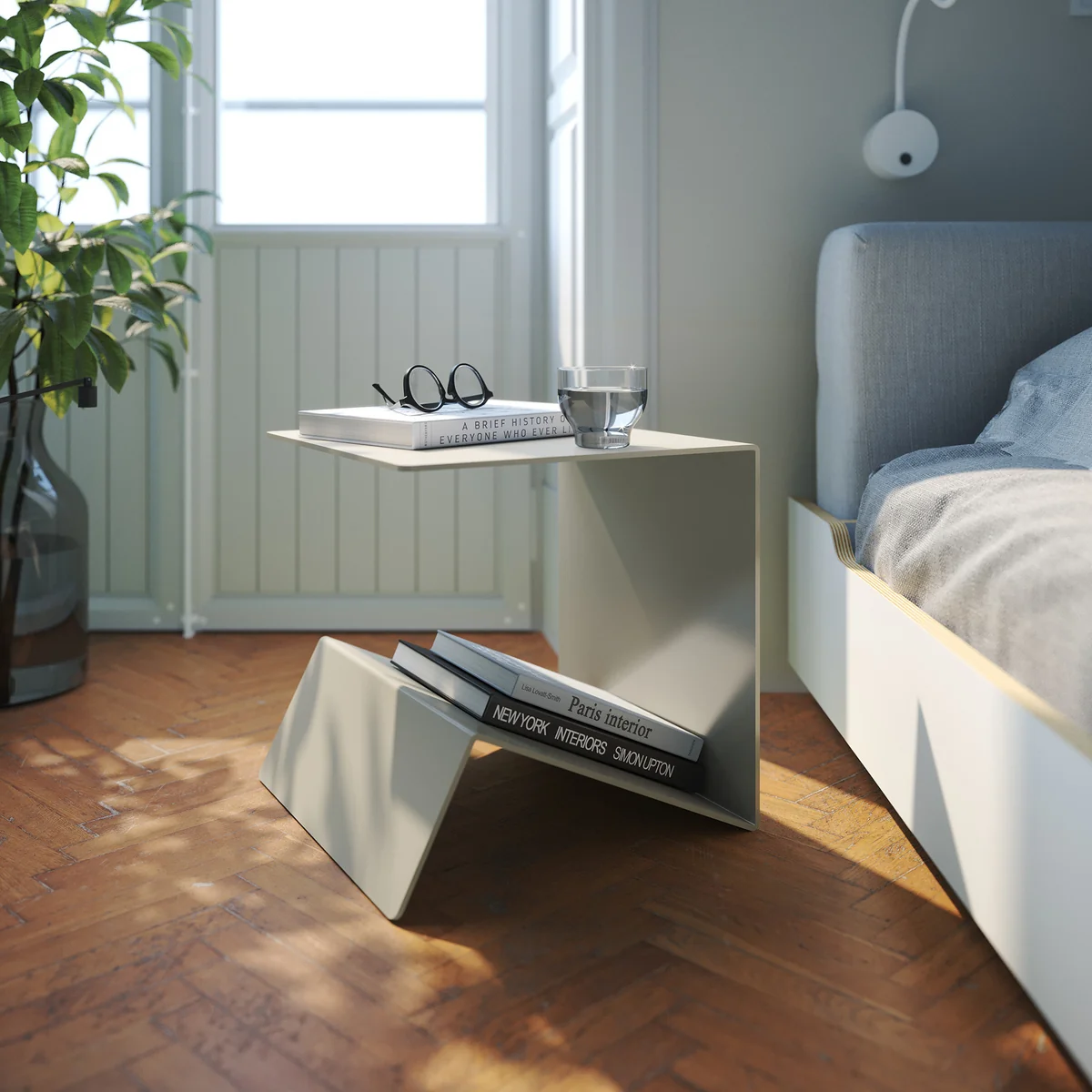 Der Beistelltisch Buk von Designer Michael Hilgers vereint minimalistisches Design mit maximaler Flexibilität. Dank seiner raffiniert gefalteten Konstruktion kann der Tisch einfach auf den Kopf gestellt werden und bietet so verschiedene Nutzungsmöglichkeiten: als Büchertisch, kleines Regal, Ablage für das Notebook oder sogar als stilvolles Notenpult. Gefertigt aus 5 mm starkem Aluminium, ist Buk robust, langlebig und in verschiedenen pulverbeschichteten Farben erhältlich.