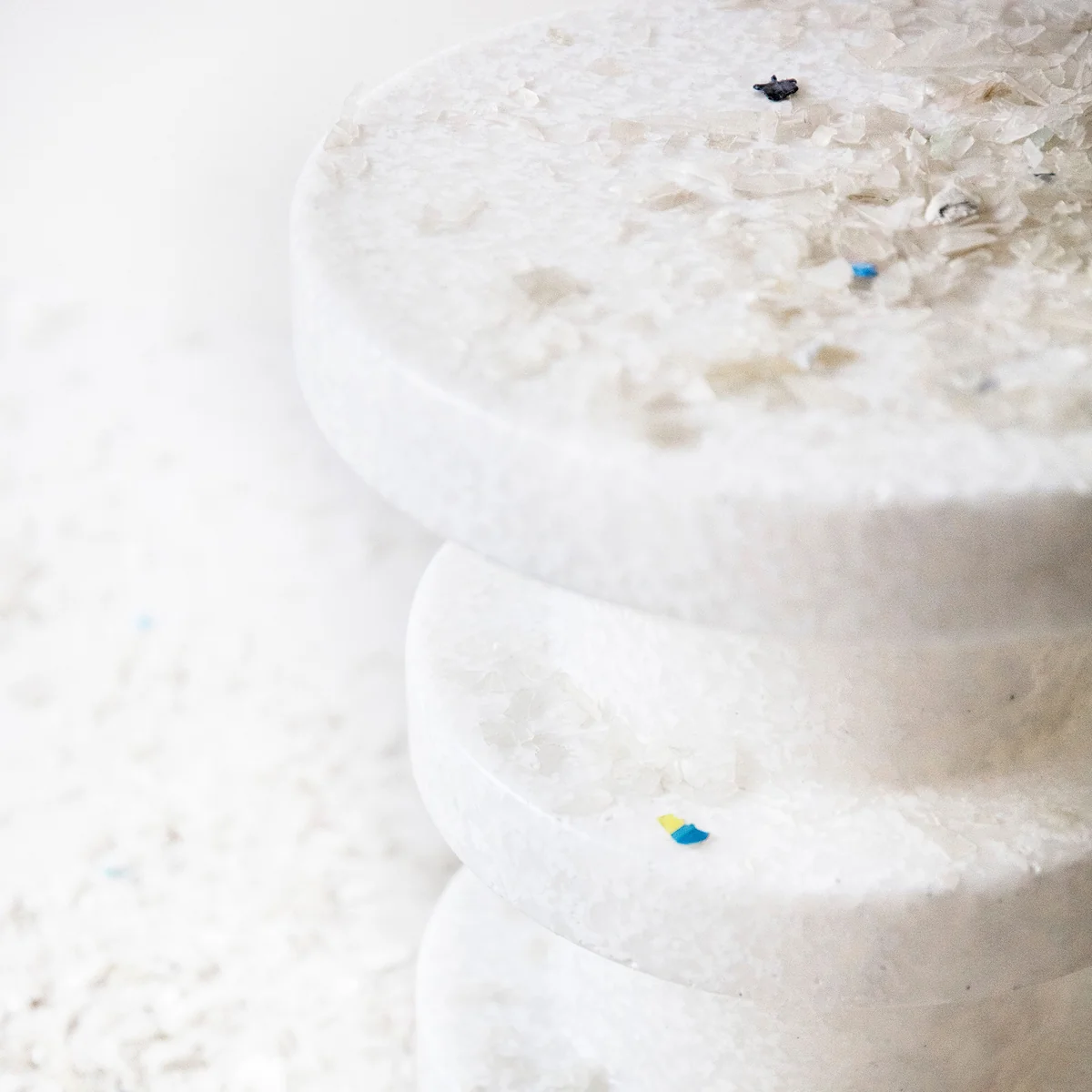 In einem speziellen Verfahren werden Kunststoff-Stückchen bei 120 Grad bis zum Schmelzpunkt erhitzt, sodass sie viele Male recycelt werden können, ohne dass das Kunststoff seine Eigenschaften verändert. Dadurch entsteht die besondere Struktur des Tisches, der in verschiedenen Varianten erhältlich ist.
