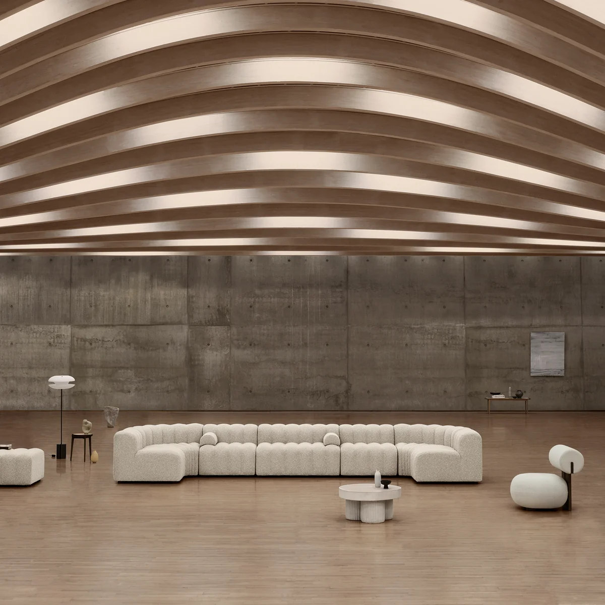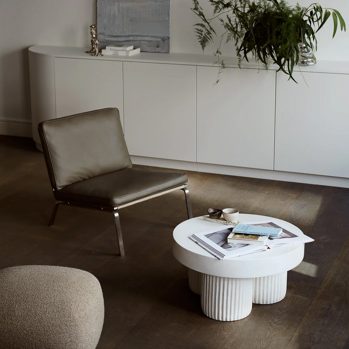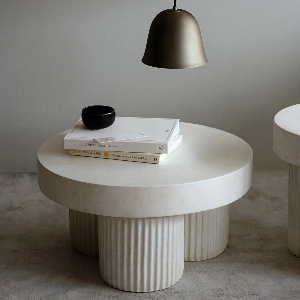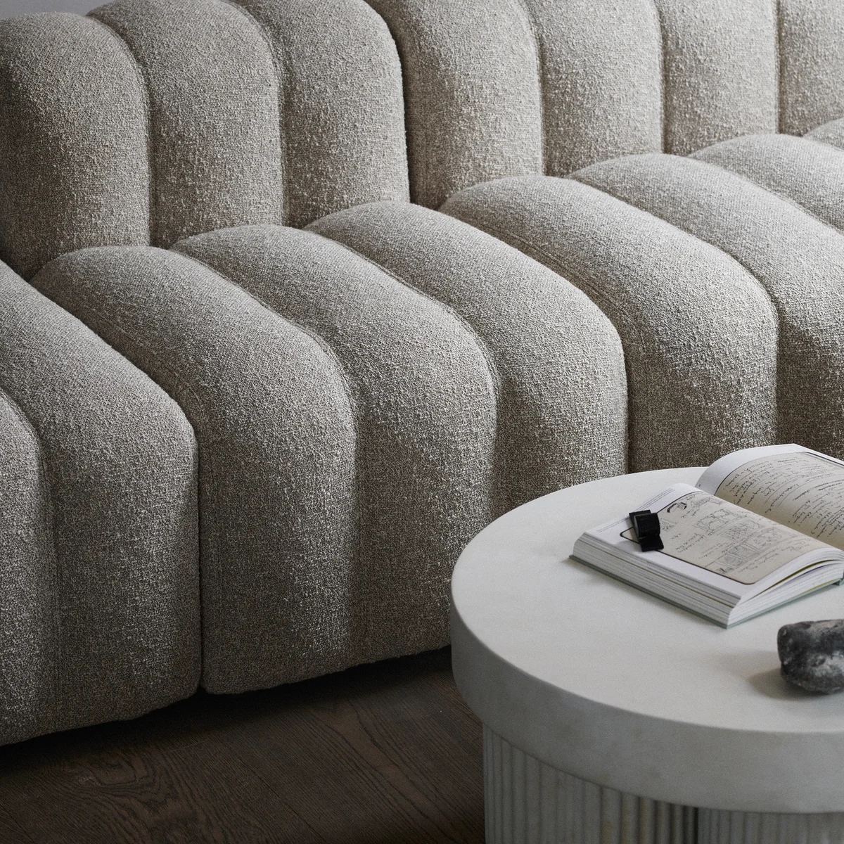 Der Gear Beistelltisch von Norr11 ist von der Brutalismus-Architektur aus der Mitte des 20. Jahrhunderts inspiriert. Der skulpturale Couchtisch ist als blockartige Struktur gestaltet, die architektonische Bauelemente aus Beton widerspiegelt. Gear verfügt über eine runde Tischplatte, die auf drei zylinderförmigen Beinen ruht. Die Beine sind durch ein geriffeltes Detail gekennzeichnet, das dem architektonischen Design eine raffinierte und organische Signatur verleiht. Hinter dem Entwurf stecken Kristian Sofus Hansen und Tommy Hyldahl.